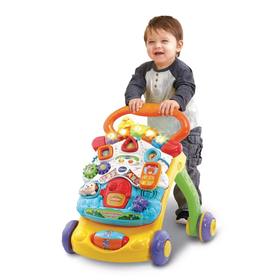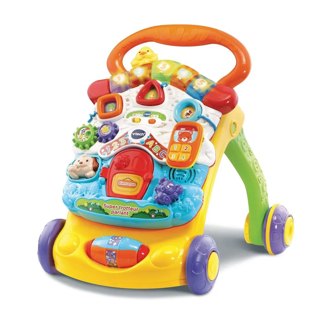 Grâce au super trotteur parlant 2 en 1, bébé pourra découvrir les mots, les chiffres, les formes, les animaux et les couleurs ! Le capteur de mouvement déclenche de joyeuses mélodies et encourage bébé à développer sa motricité ainsi que son langage et sa coordination. Il pourra jouer où il le souhaite grâce au tableau d’activités détachable. Super trotteur parlant 2 en 1 propose 10 activités pour éveiller bébé et plus de 100 chansons, mélodies, sons et phrases. Le trotteur comporte un système de freinage pour contrôler la vitesse, il s’agit donc du trotteur idéal afin que votre enfant puisse faire de nombreuses découvertes.