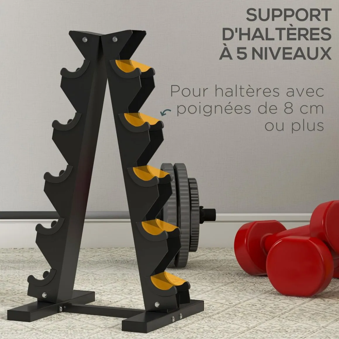 – Support avec 10 emplacements dédiés pour ranger 5 paires d’haltères