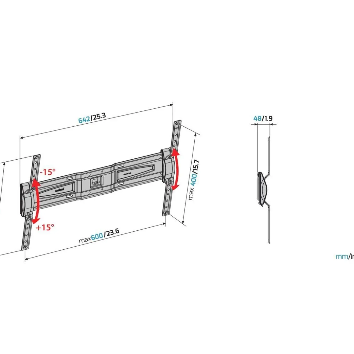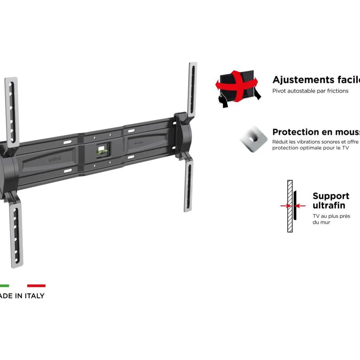 | Spécificités | Pour TV de 50 à 82 » (127 à 208 cm) -Compatible VESA 300/400/600 -Poids maximum supporté : 65 KG -Inclinaison : +/- 15° -Visserie et niveau à bulle inclus -Livré prémonté -Garantie : 10 ans | |
