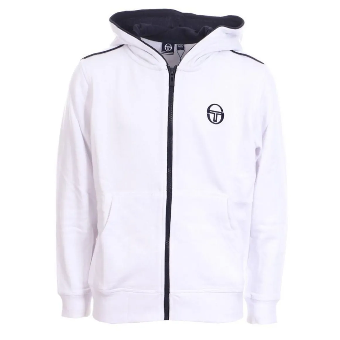 Optez vite pour le sweat de la marque Sergio Tacchini Manches longues Capuche Fermeture zippée 2 poches Logo brodé Coloris : Blanc Composition : 80% coton , 20% polyester