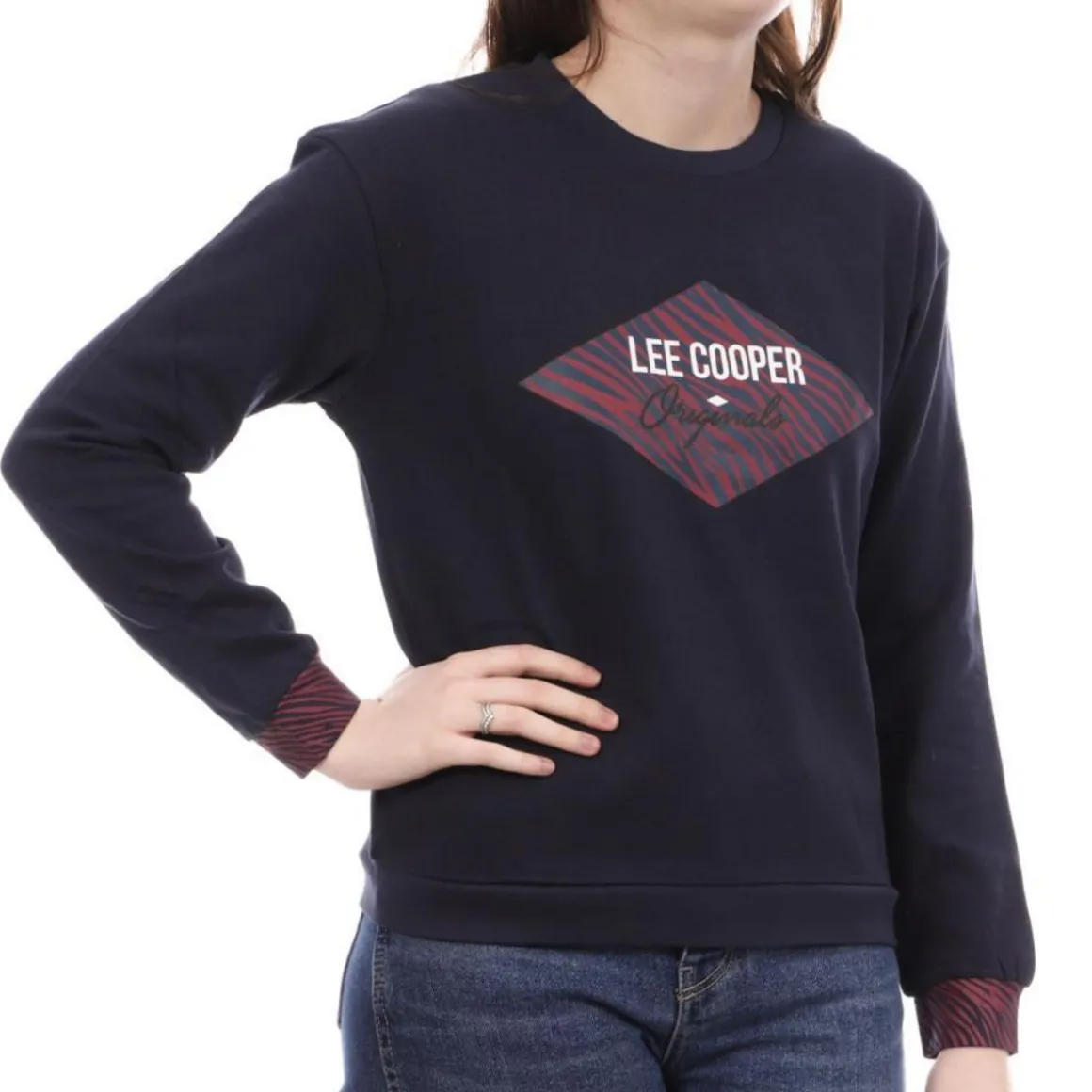 Craquez pour le sweat femme de la marque Lee Cooper Manches longues Col rond Coloris : Marine Composition : 98% coton , 2% viscose Imprimé Lee Cooper zèbre