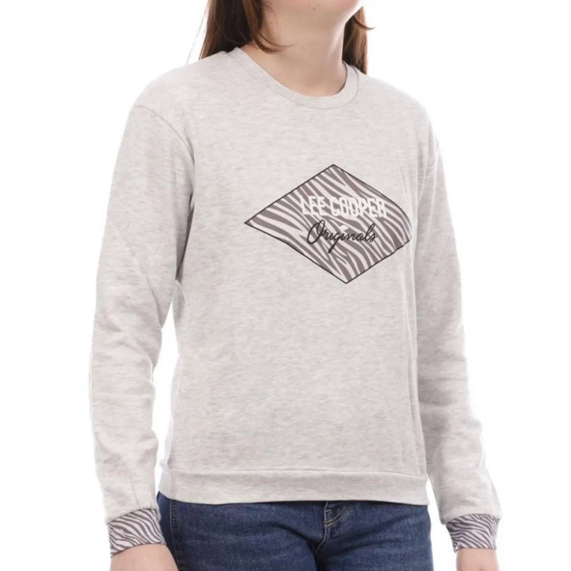 Craquez pour le sweat femme de la marque Lee Cooper Manches longues Col rond Coloris : Gris Composition : 98% coton , 2% viscose Imprimé Lee Cooper zèbre
