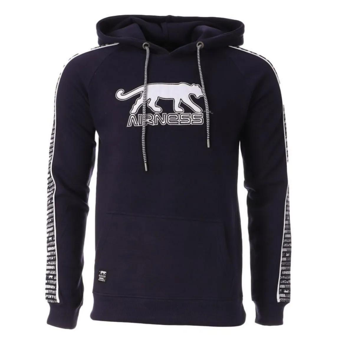Optez pour ce sweat de la marque AIRNESS ! Coloris : marine Manches longues Avec capuche et cordon de serrage Composition : 60% Coton, 40% Polyester Logo Airness à l’avant Intérieur doux et molletonné 2 bandes blanches sur le côté