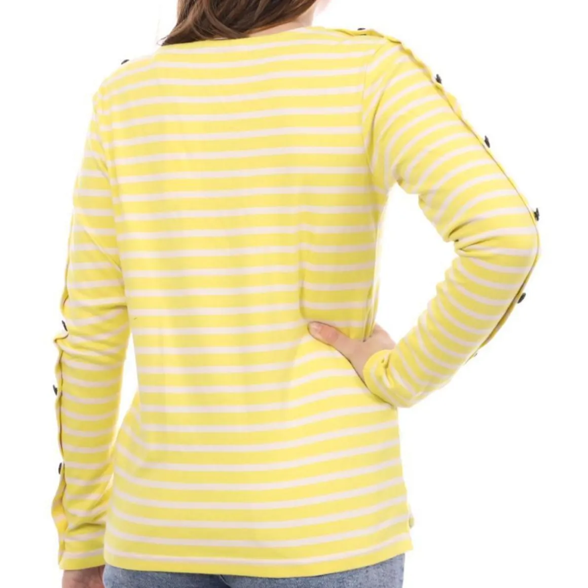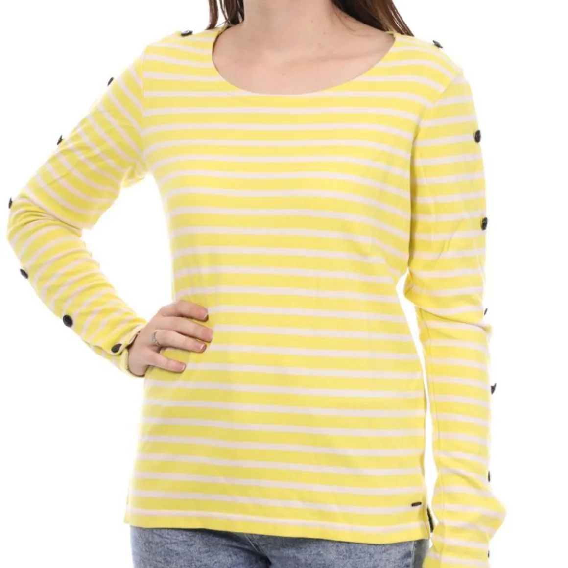 T-shirt femme de la marque Scotch and Soda ! Manches longues Col rond Détails boutons sur les manches Rayures Coloris : jaune / Crème Composition : 100% coton