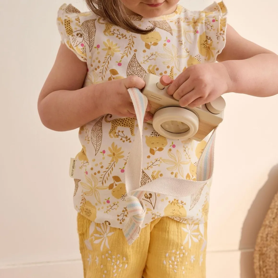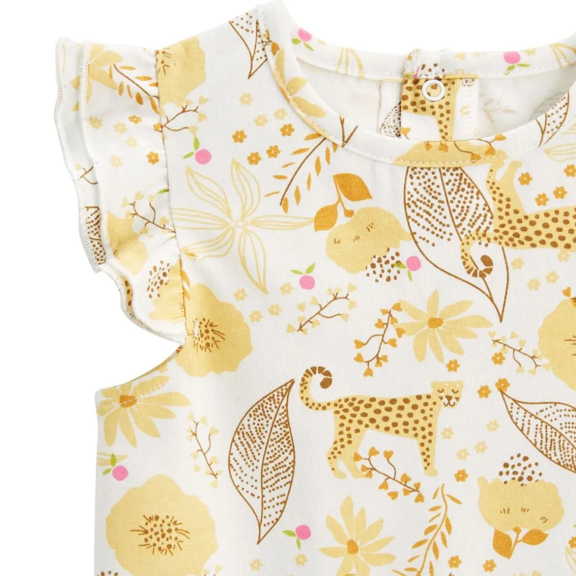 Craquez pour ce t-shirt adorable, parfait pour apporter une touche italienne au dressing de votre petit bout ! Avec ses jolis volants sur les épaules, son imprimé floral délicat et son adorable petit guépard, il respire la dolce vita. Produit labellisé STANDARD 100 by OEKO-TEX ® (BJ020 189402 TESTEX)