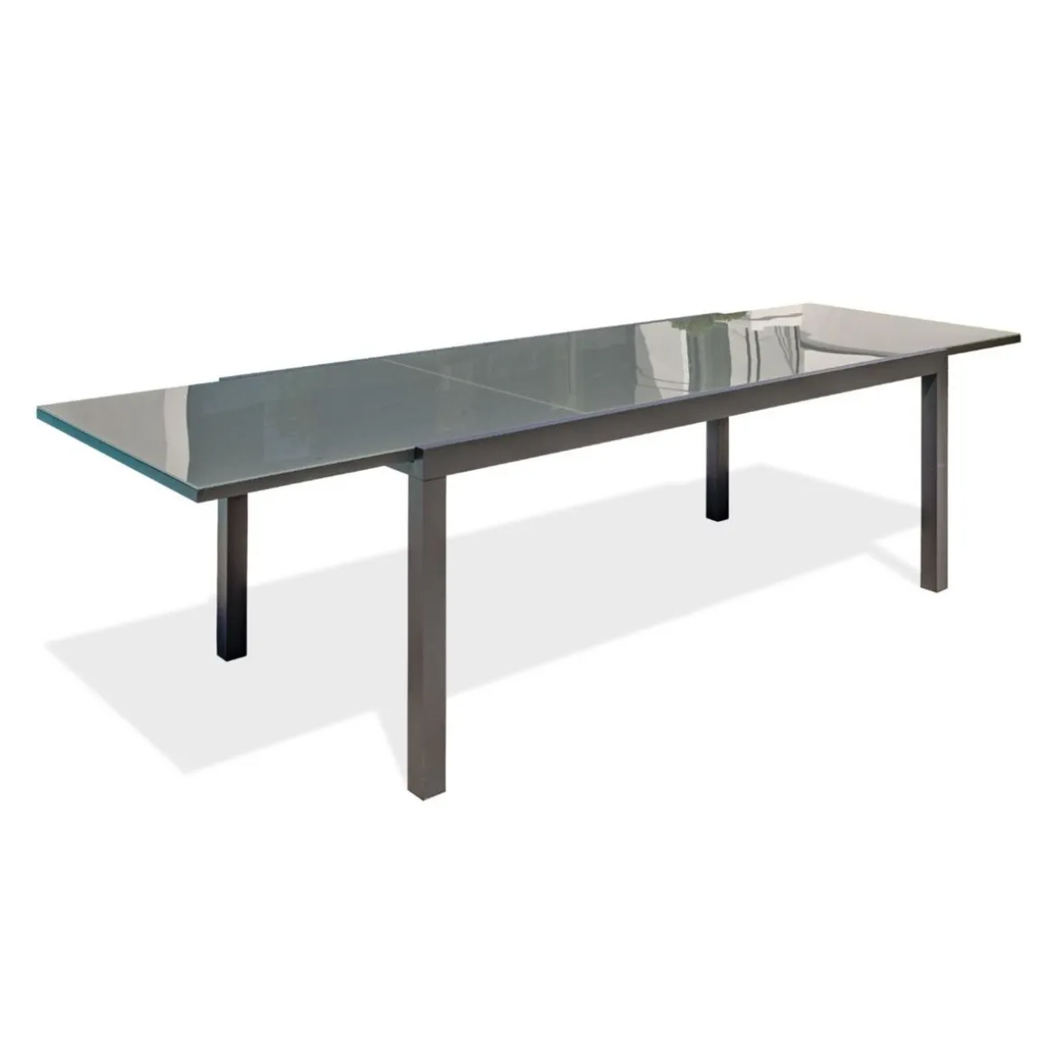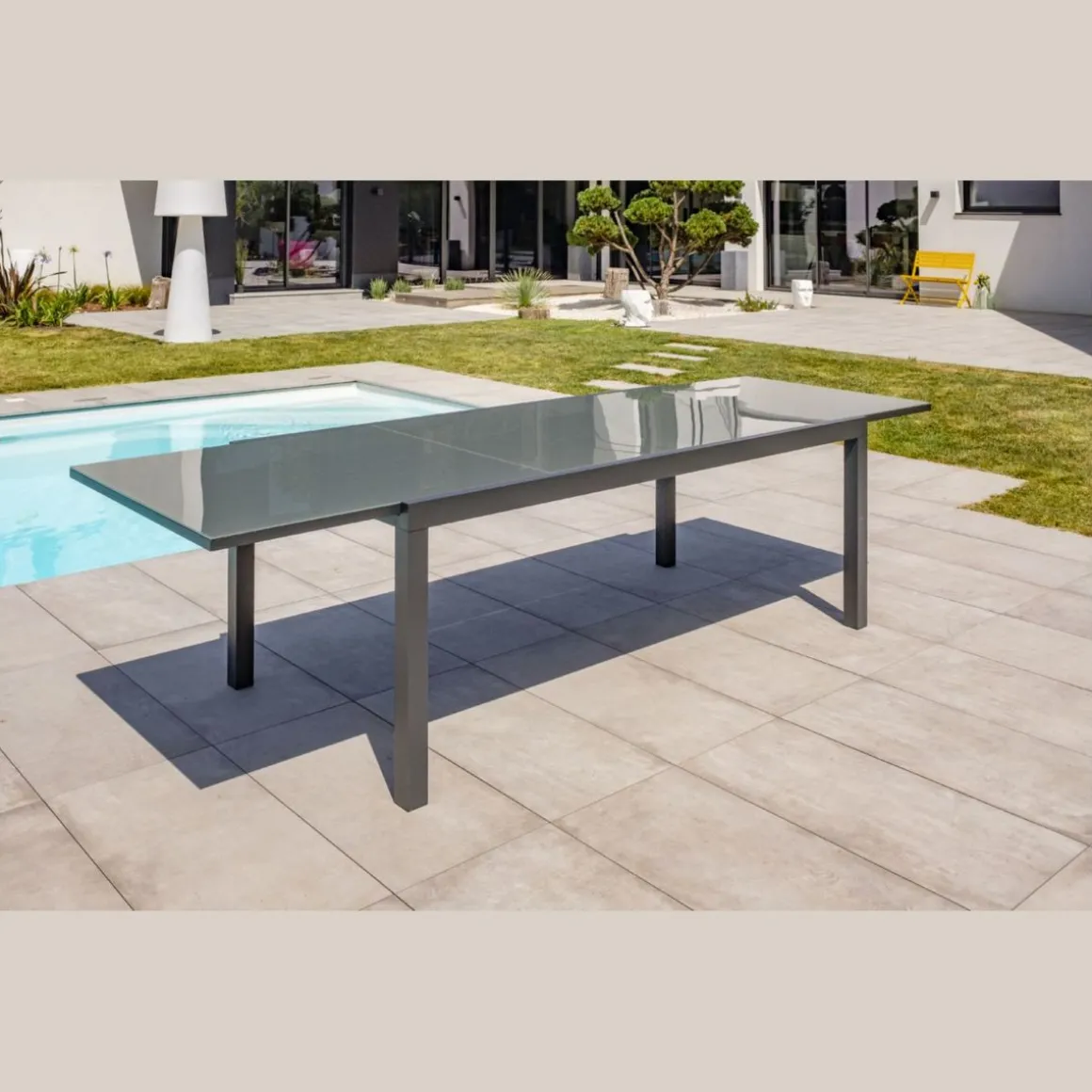 La table de jardin TOLEDE est en aluminium gris anthracite. Son plateau en verre est e?quipe? d’une rallonge astucieuse et discre?te.
