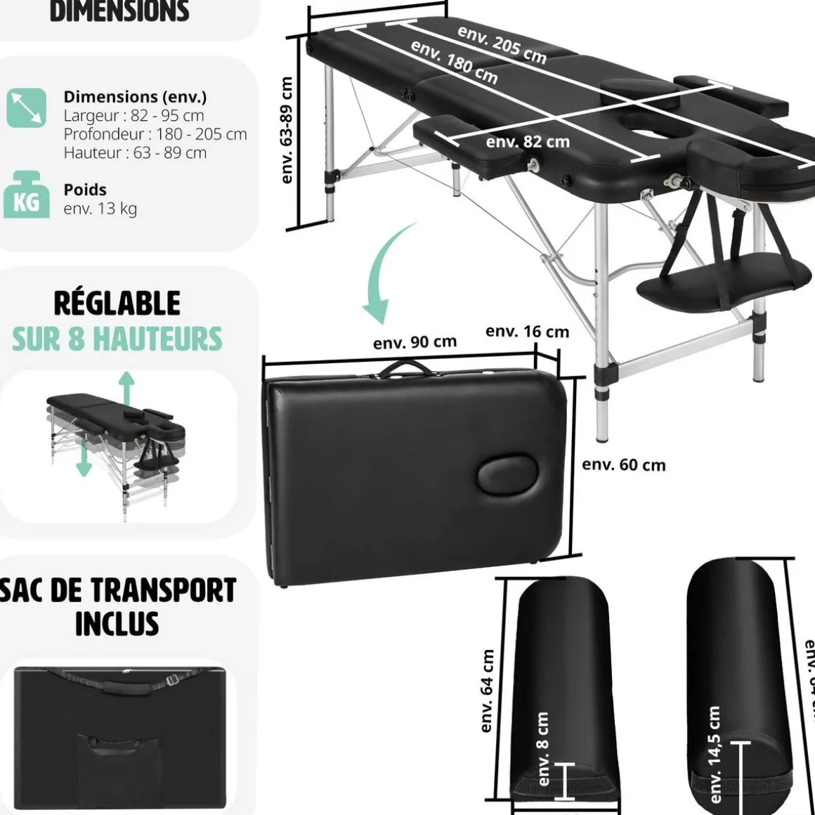 - Longueur de la table sans support de tête : env. 180 cm