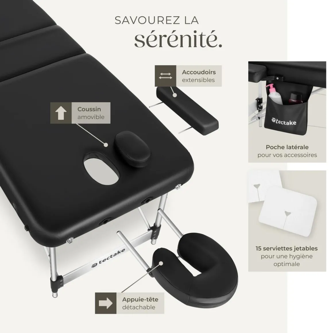 - Table de massage à 3 zones réglable en hauteur avec fonction pliable.