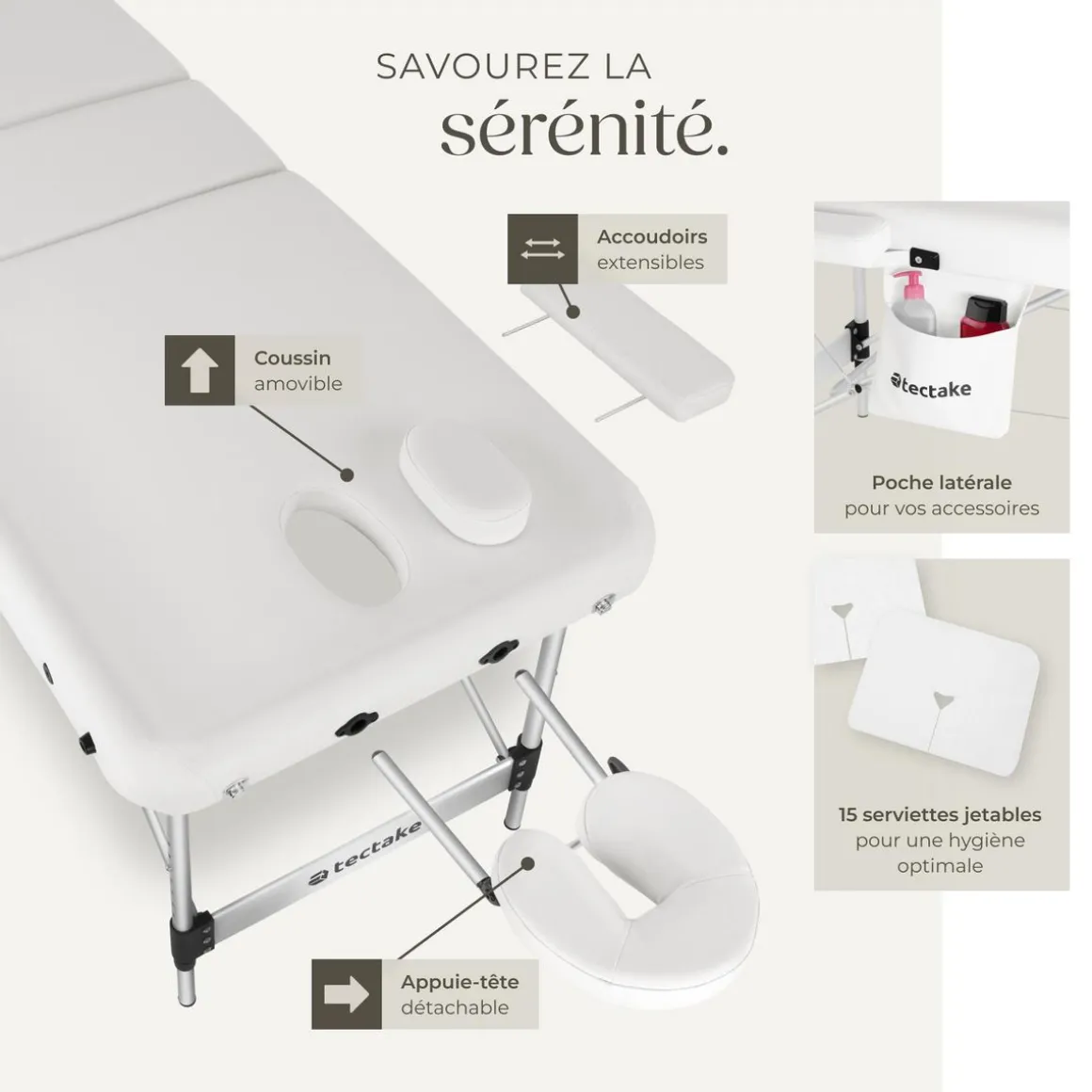 - Table de massage à 3 zones réglable en hauteur avec fonction pliable.