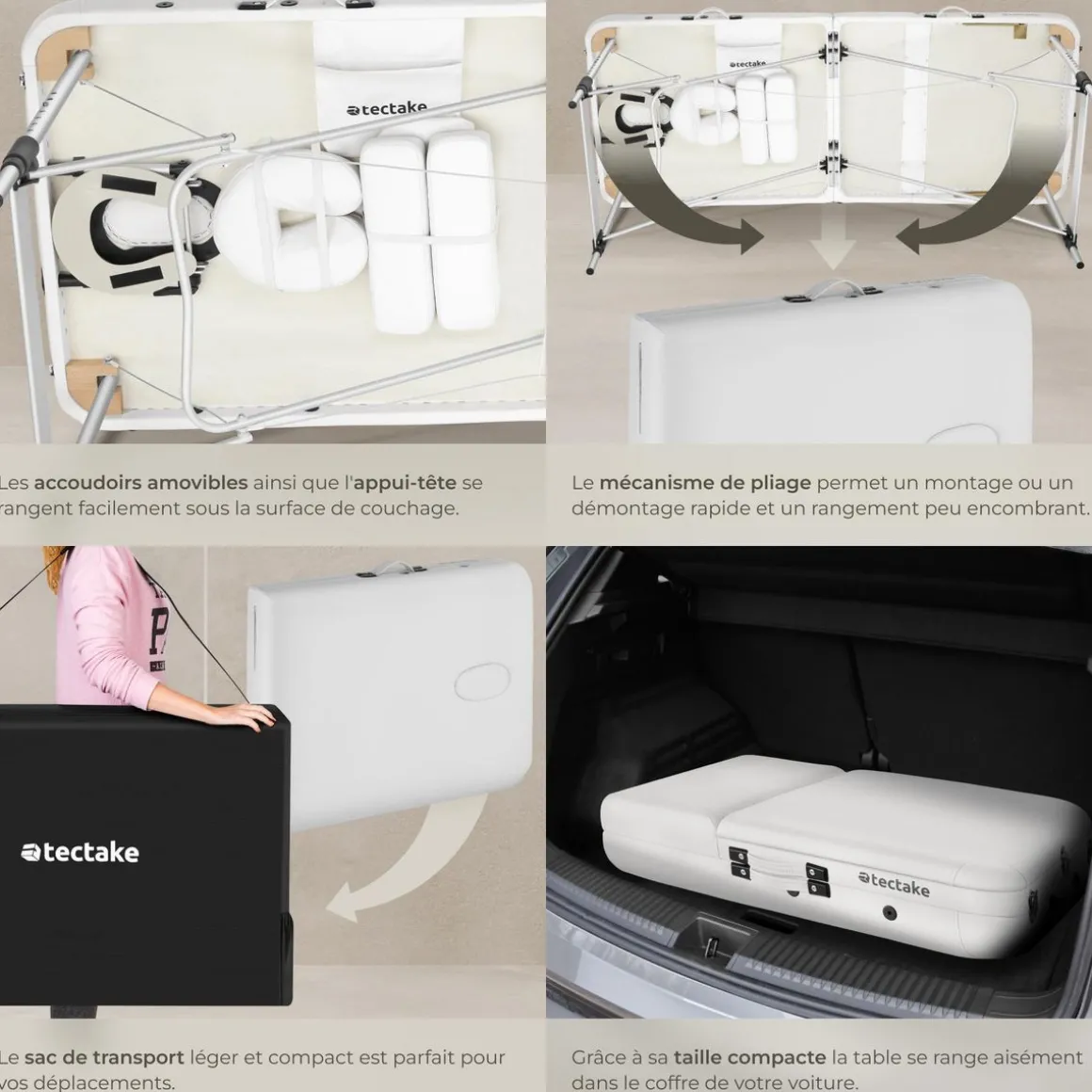 L’appui-tête, le coussin facial et les accoudoirs sont amovibles facilitant le nettoyage et offrant un ajustement personnalisé pour un confort maximal. Une fois la séance terminée la table se plie de manière compacte et se range facilement dans son sac de transport, idéale pour les professionnels ou pour un rangement peu encombrant.