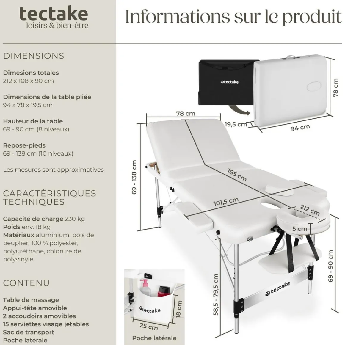 Offrez-vous une expérience de détente absolue avec la table de massage pliable 3 zones Ko Tao de Tectake. Conçue avec des matériaux haut de gamme et des fonctionnalités intelligentes, elle transforme chaque massage en un moment unique, que ce soit chez vous ou ailleurs.