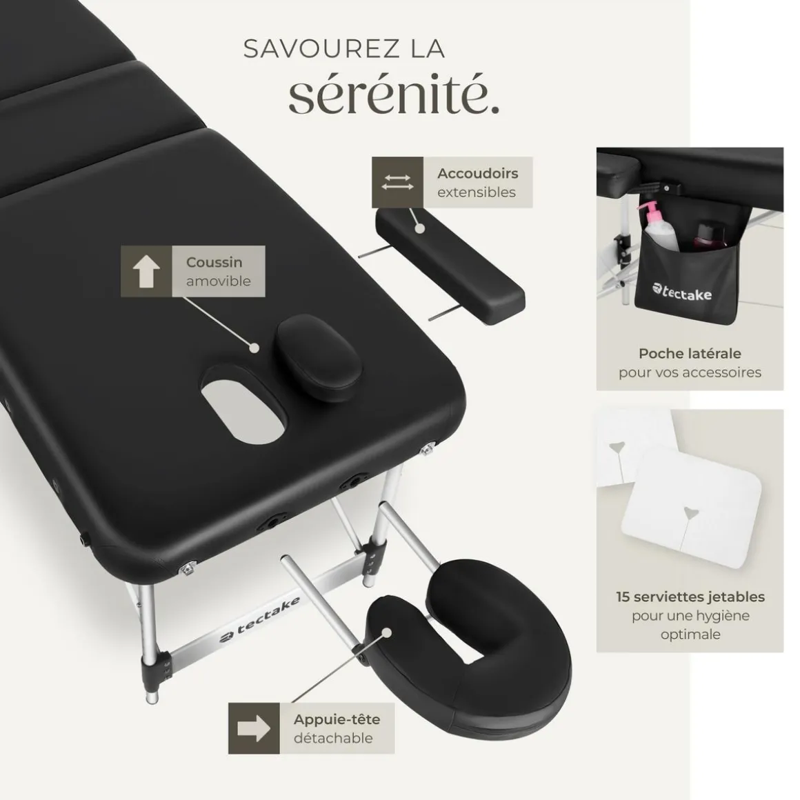 Pour une expérience encore plus agréable, 15 serviettes visage jetables sont fournies et peuvent être facilement fixées à l’appui-tête garantissant un confort et une hygiène irréprochables. Une poche latérale astucieuse offre un espace dédié à vos accessoires, tels que les huiles de massage ou les lingettes afin de les garder à portée de main en permanence.