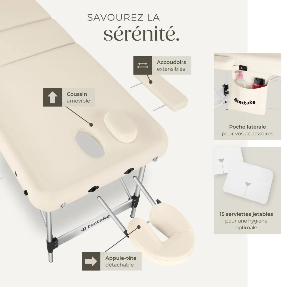 - Table de massage à 3 zones réglable en hauteur avec fonction pliable.