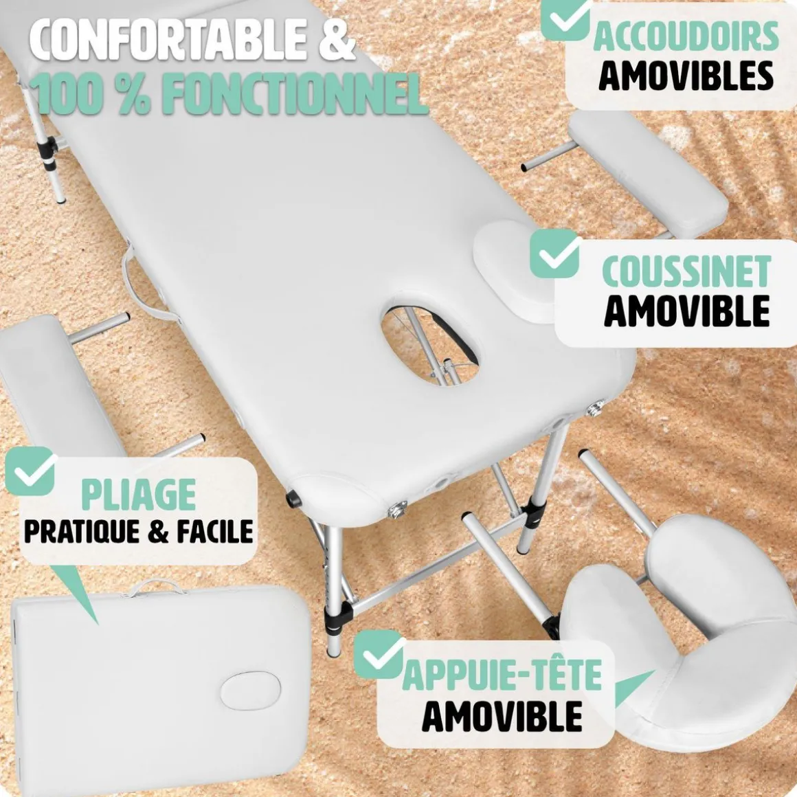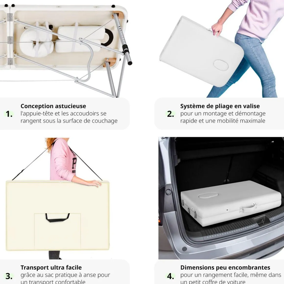Le système de pliage rapide permet de ranger la table de manière compacte et de la transporter facilement grâce au sac de transport inclus. Les différents éléments, y compris le repose-tête et les accoudoirs, peuvent être fixés sous la table après utilisation, ce qui facilite encore plus le transport et le rangement.