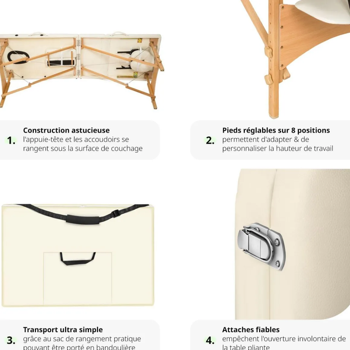 Cette table de massage pliante se distingue par son cadre en bois robuste et ses accessoires bien pensés. Elle est facilement et rapidement adaptable à différents besoins grâce à ses réglages en hauteur, jambes, cou et bras. Le repose-tête multifonction ergonomique et amovible, fixé par attaches auto-agrippantes, assure un soutien optimal pour une expérience de massage encore plus agréable. De plus, les repose-tête et bras sont réglables pour s’adapter précisément à chaque utilisateur.