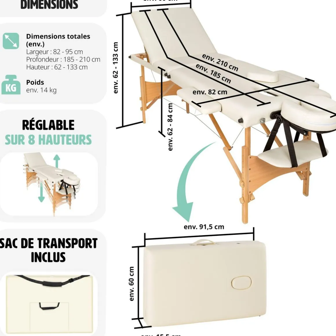 La table de massage portable pliante à 3 zones DANIEL est fabriquée avec des matériaux de haute qualité, incluant un vinyle résistant à l’eau et à l’huile, garantissant une longue durabilité et un entretien facile. Le cadre en bois offre une stabilité exceptionnelle tout en ajoutant une touche d’élégance à votre espace de bien-être.