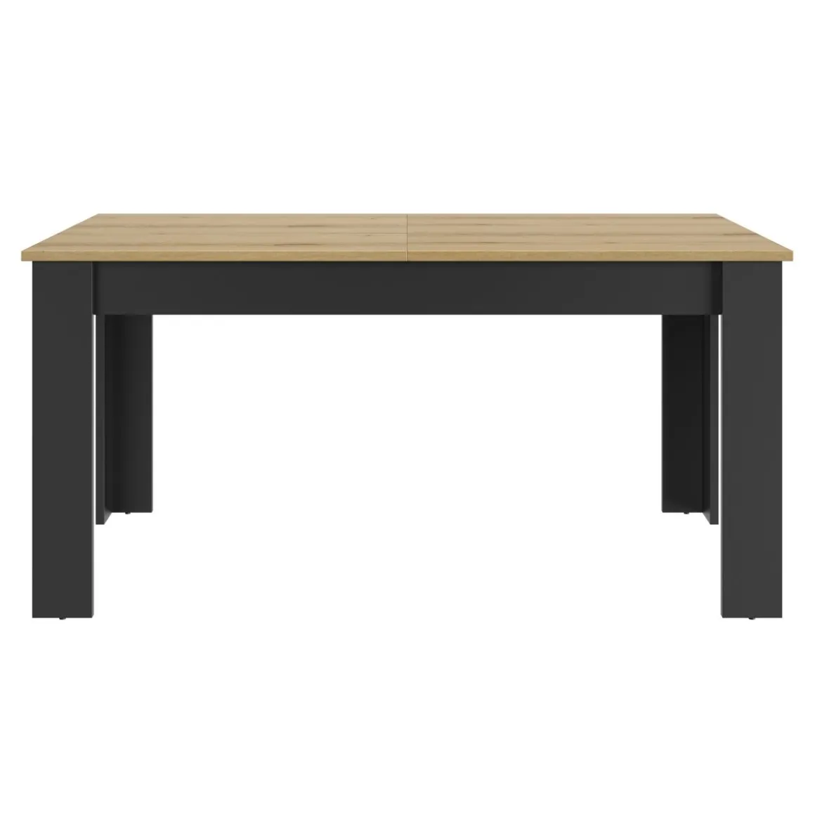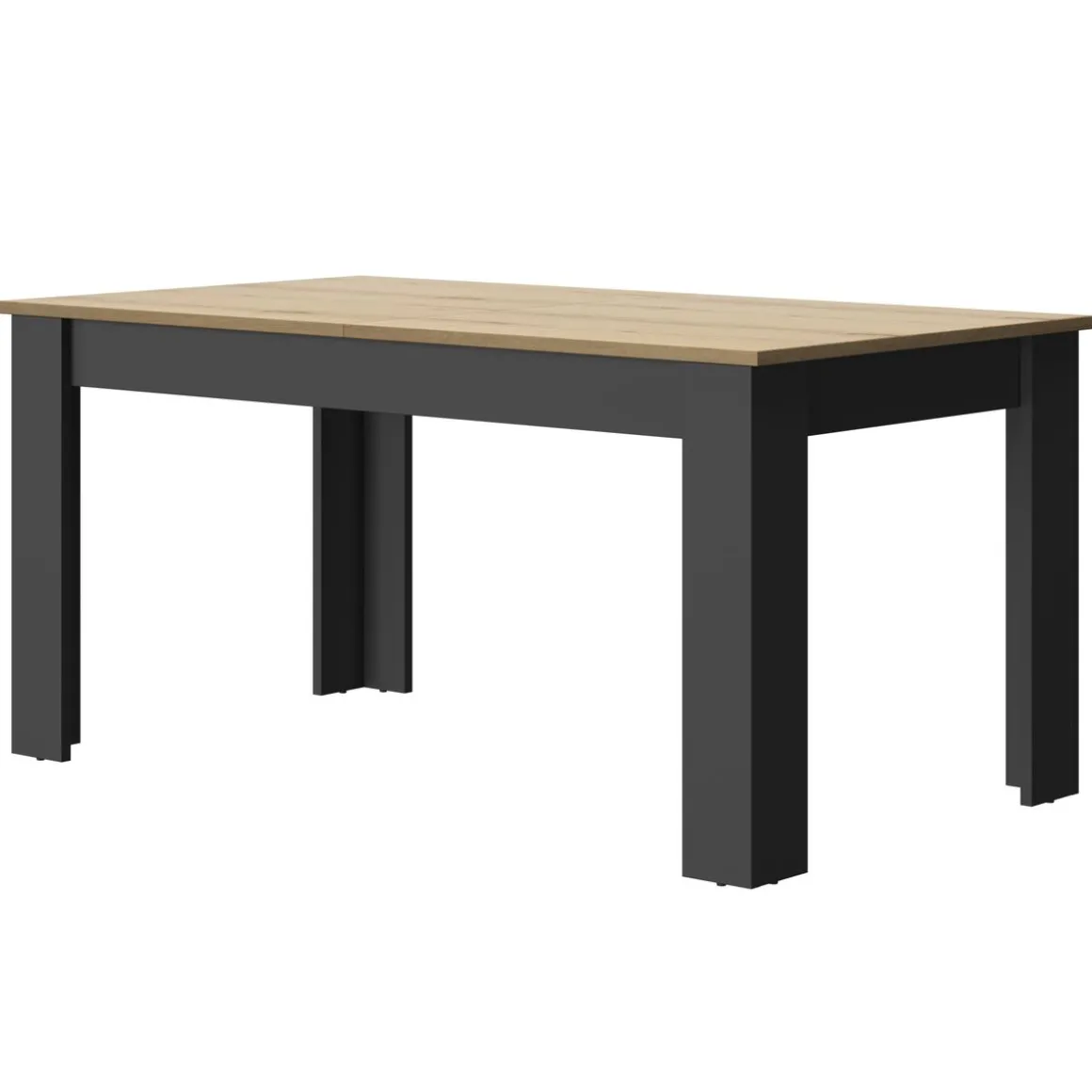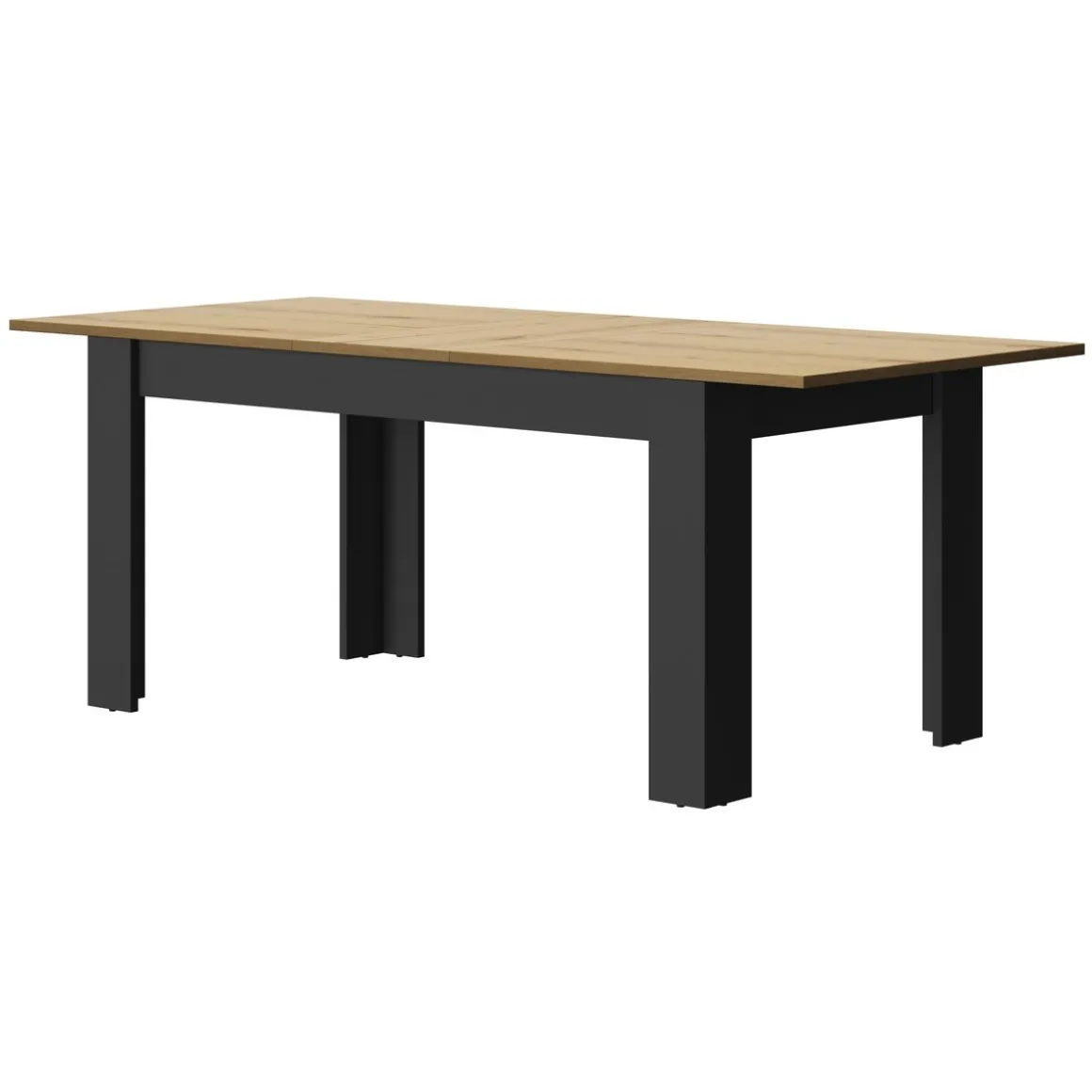Plateau et Allonge : panneaux de particules revêtus papier imitation Chêne Helvezia. Pieds et ceinture : panneaux de particules revêtus papier Noir.