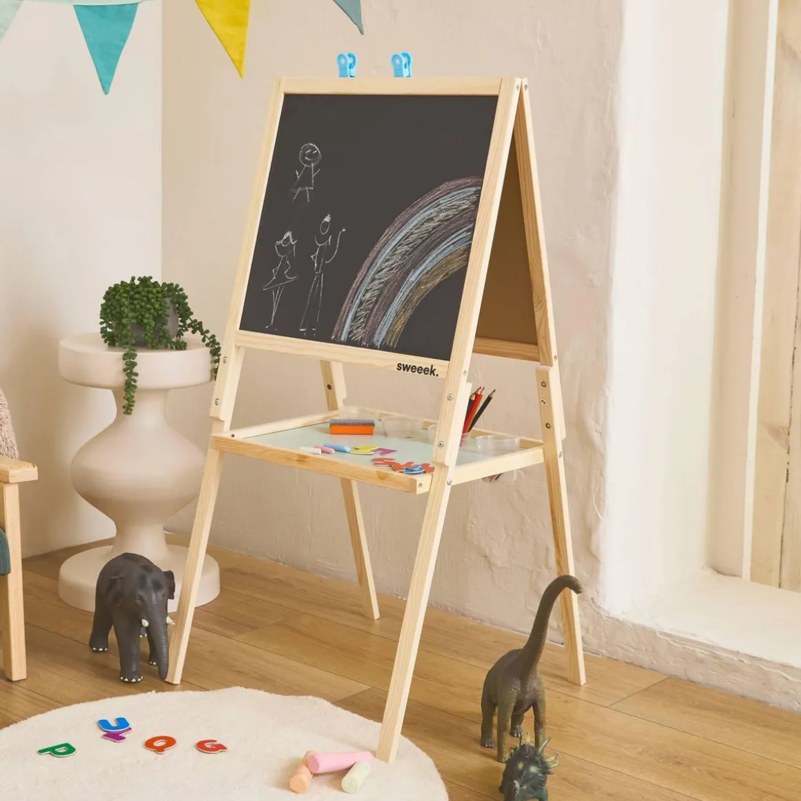 Le tableau double face KIDDO est le prochain élément indispensable de votre salle de jeu. Avec ses lettres aimantées et ses 2 attaches vos enfants passeront des heures à s’amuser. On aime son espace de rangement sous les deux faces du tableau ainsi que les 4 pots en plastiques fournis pour y déposer craies et stylos. Sa structure en bois lui permet de s’intégrer facilement à la décoration de la chambre de votre enfant. Ses pieds évasés lui permettent quant à eux de rester stable lors de son utilisation.