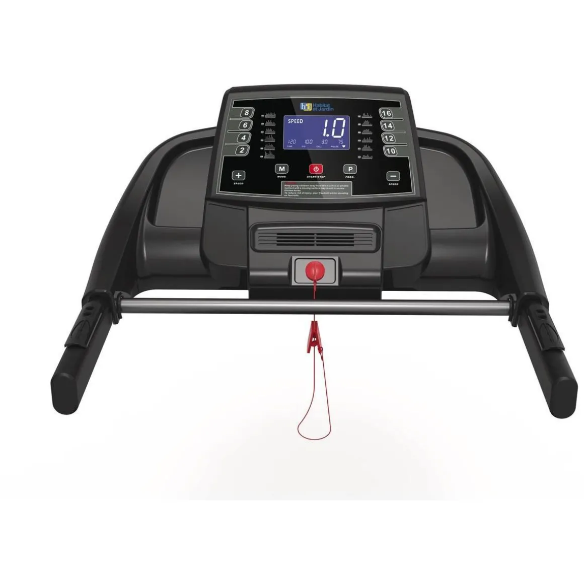 Descriptif écran LCD : Temps, distance, vitesse, calories et pouls.