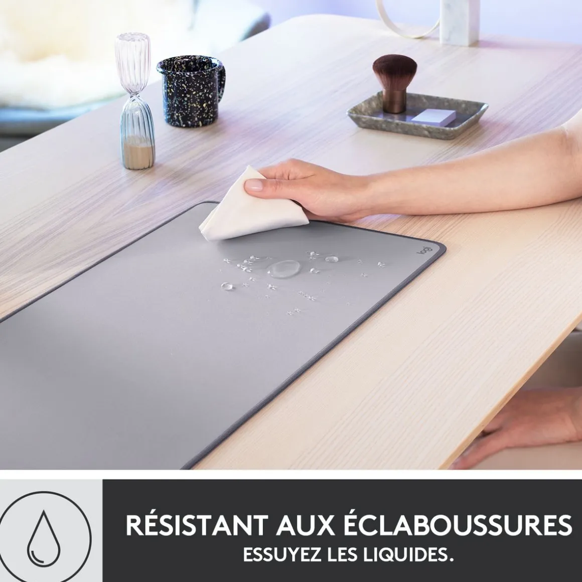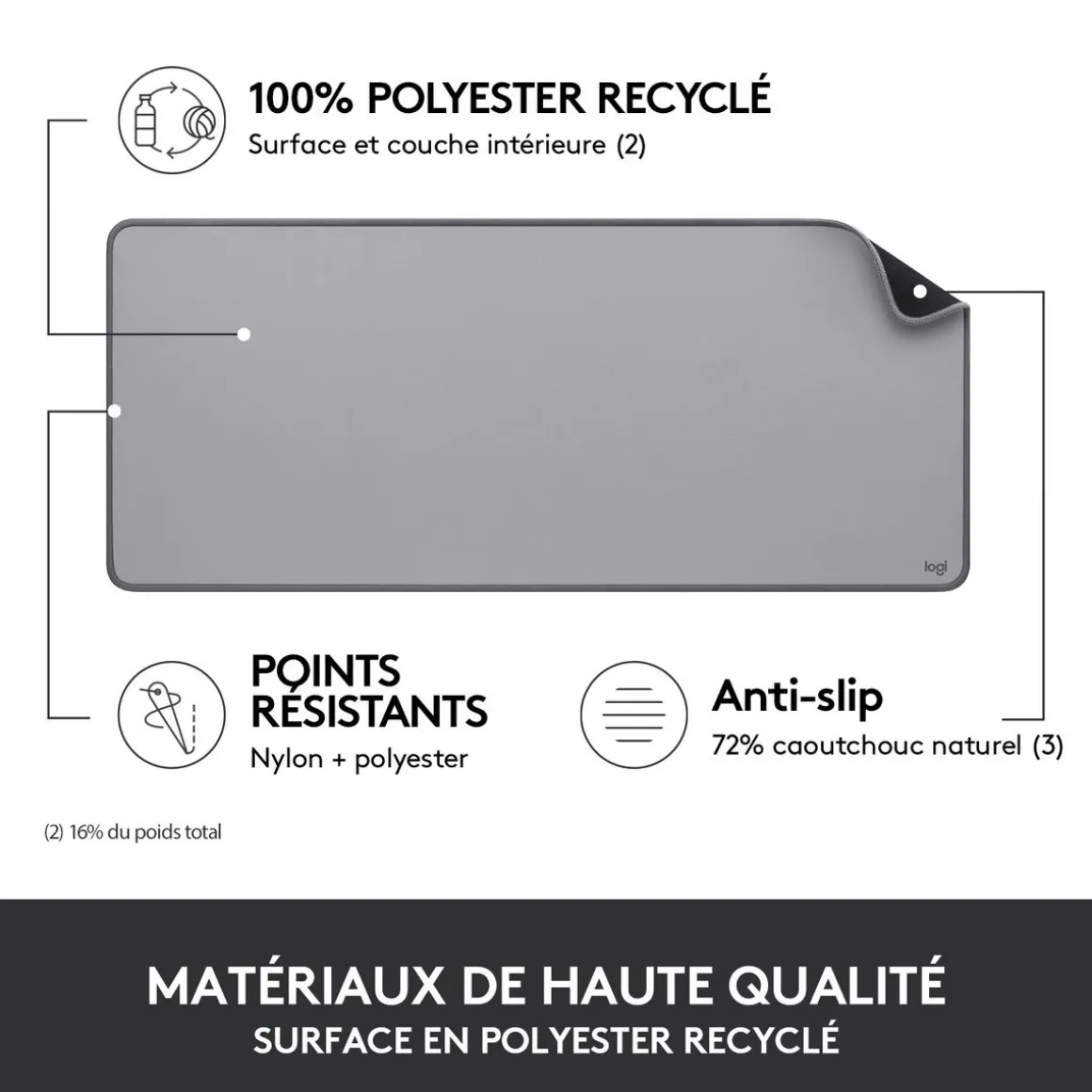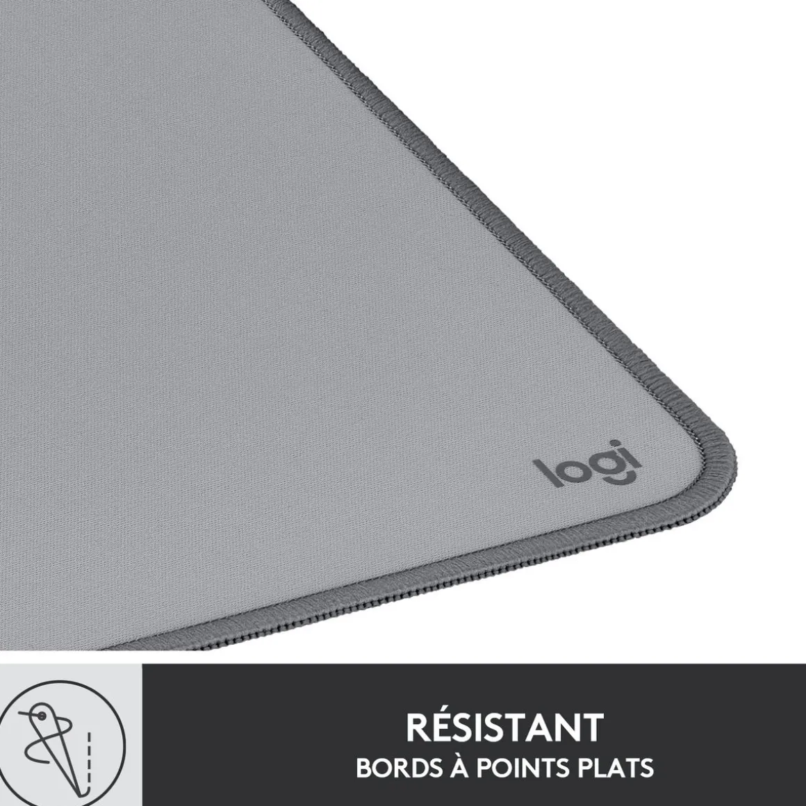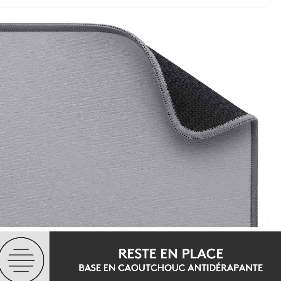 La surface anti-éclaboussures résiste aux accidents du quotidien, tandis que le tissu fin offre à votre souris un glissement silencieux et sans effort. Avec ses fibres à la fois douces et résistantes, le Logitech Desk Mat est infroissable et anti-rétrécissement, avec des bords anti-effilochage à points plats.
