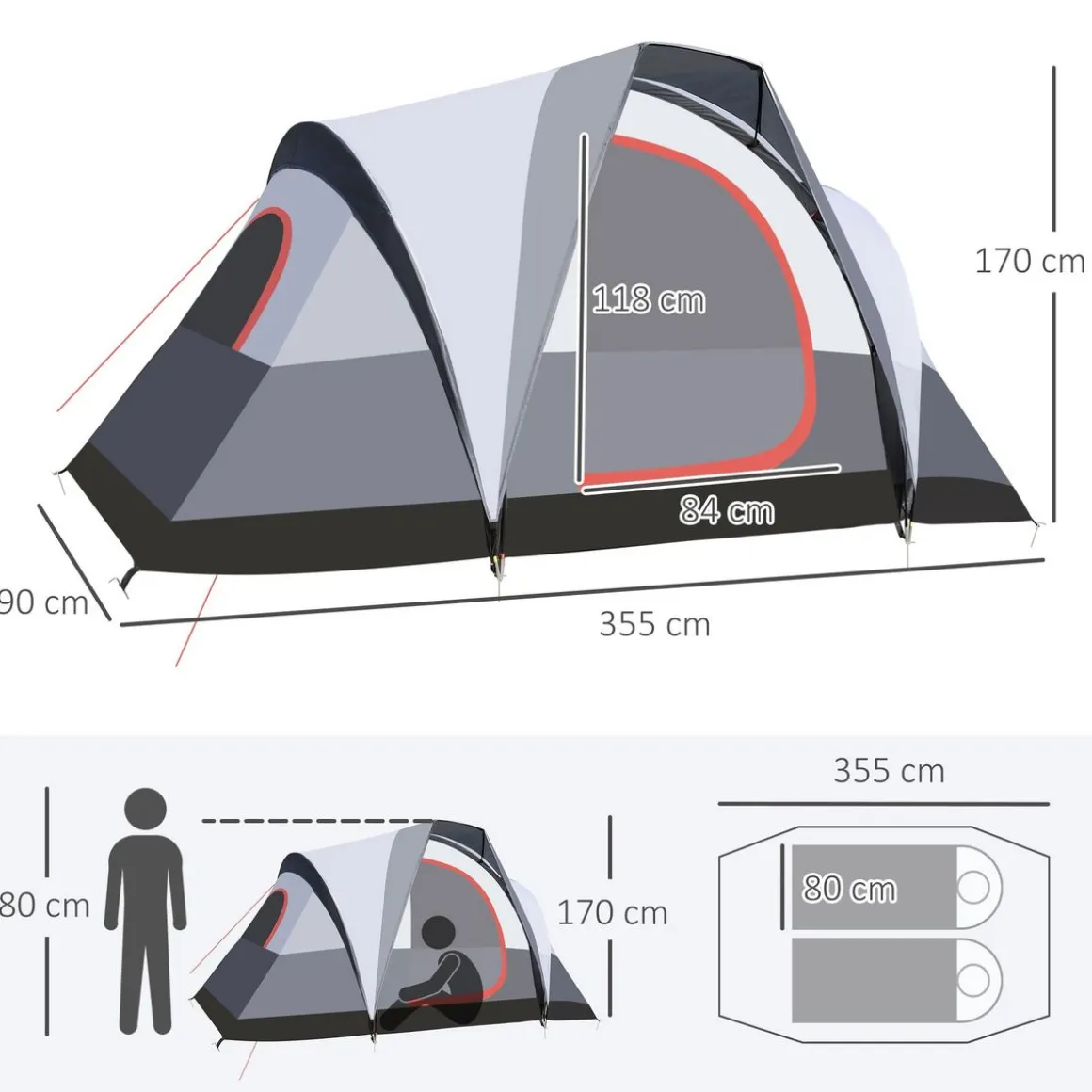 – Sac d’entrée avec auvent vous offrant une zone d’ombrage supplémentaire et idéal pour ranger votre équipement ou vos bagages