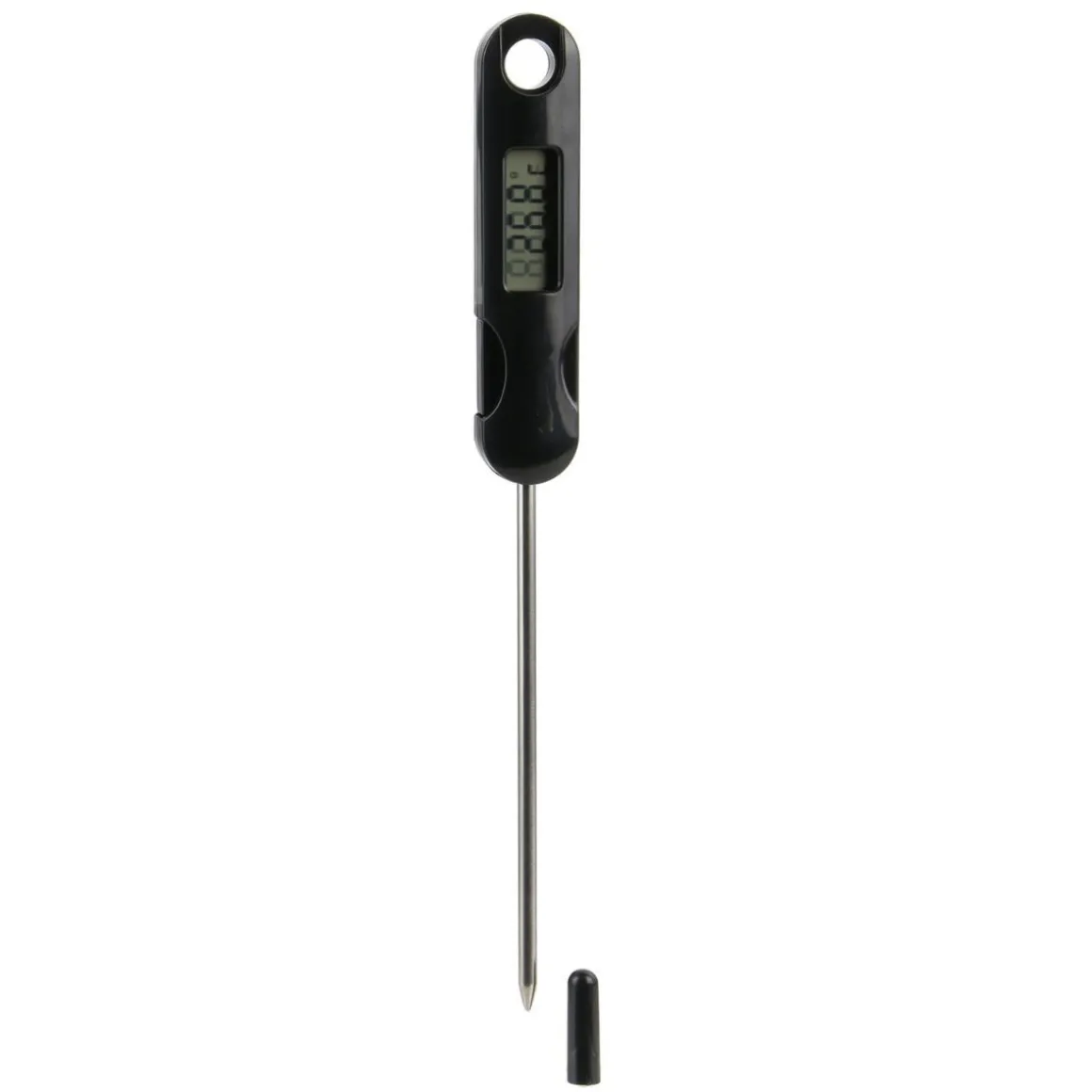 Thermomètre de cuisine digital noir et rouge en plastique avec affichage digital. Températures maximales : -50°C à +30°C. Facile d’entretien. Pile incluse. Non compatible au lave-vaisselle.