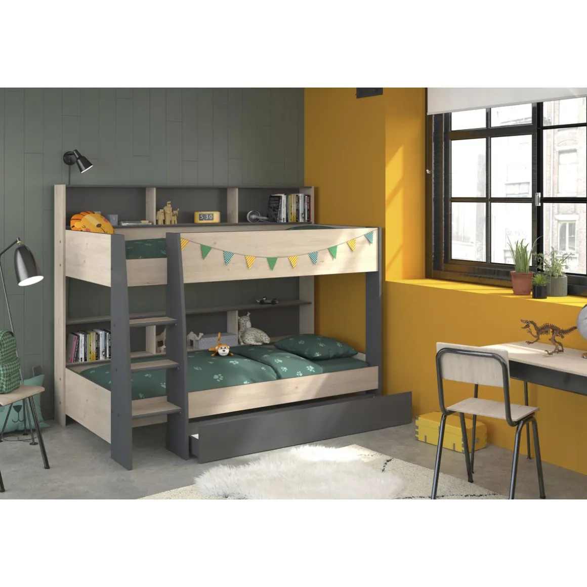 Le tiroir pour lit superposé Mateo en bois et panneaux de particules, est idéal pour obtenir du rangement supplémentaire sous le lit superposé de la même gamme.