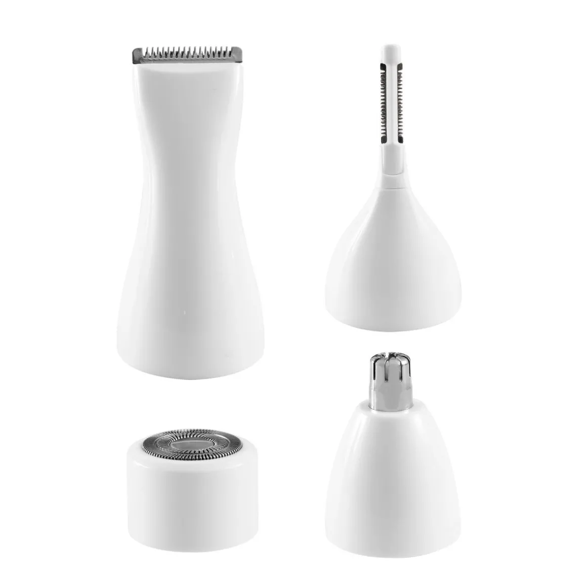 - Accessoires : 1x tête de rasoir du visage, 1x tête de rasoir du corps avec 1 x sabot ajustable, 1 x tête à sourcils avec capuchon de protection, 1 x coupe poils oreille nez, 2 x sabots de sourcils et 1x brosse de nettoyage