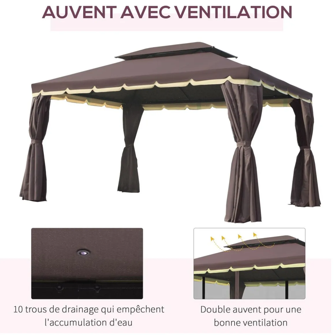 Cette magnifique tonnelle style colonial pourrait vous offrir de l’ombre ou vous le souhaitez ! C’est est un barnum de jardin design et pratique idéal pour toute la famille ! Equipé d’un toit double, de 4 moustiquaires et 4 rideaux, vous et vos invités seront parfaitement protégés contre le soleil et contre les insectes tout en profitant d’un air respirable et agréable. En plus, l’installation de cette tonnelle de 12 m² de surface sol environ est facile et rapide. Laissez-vous tenter !