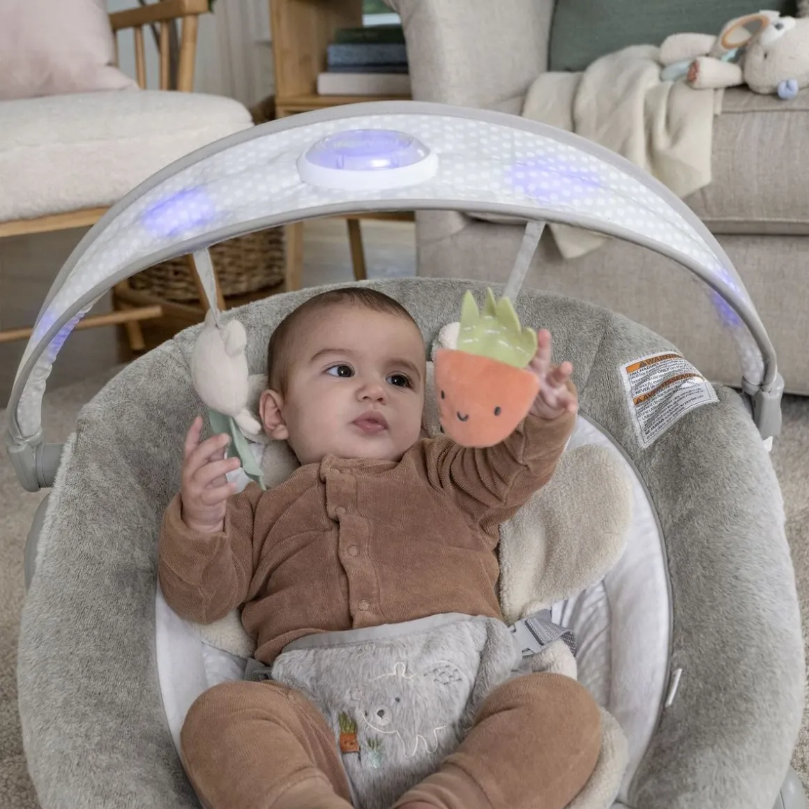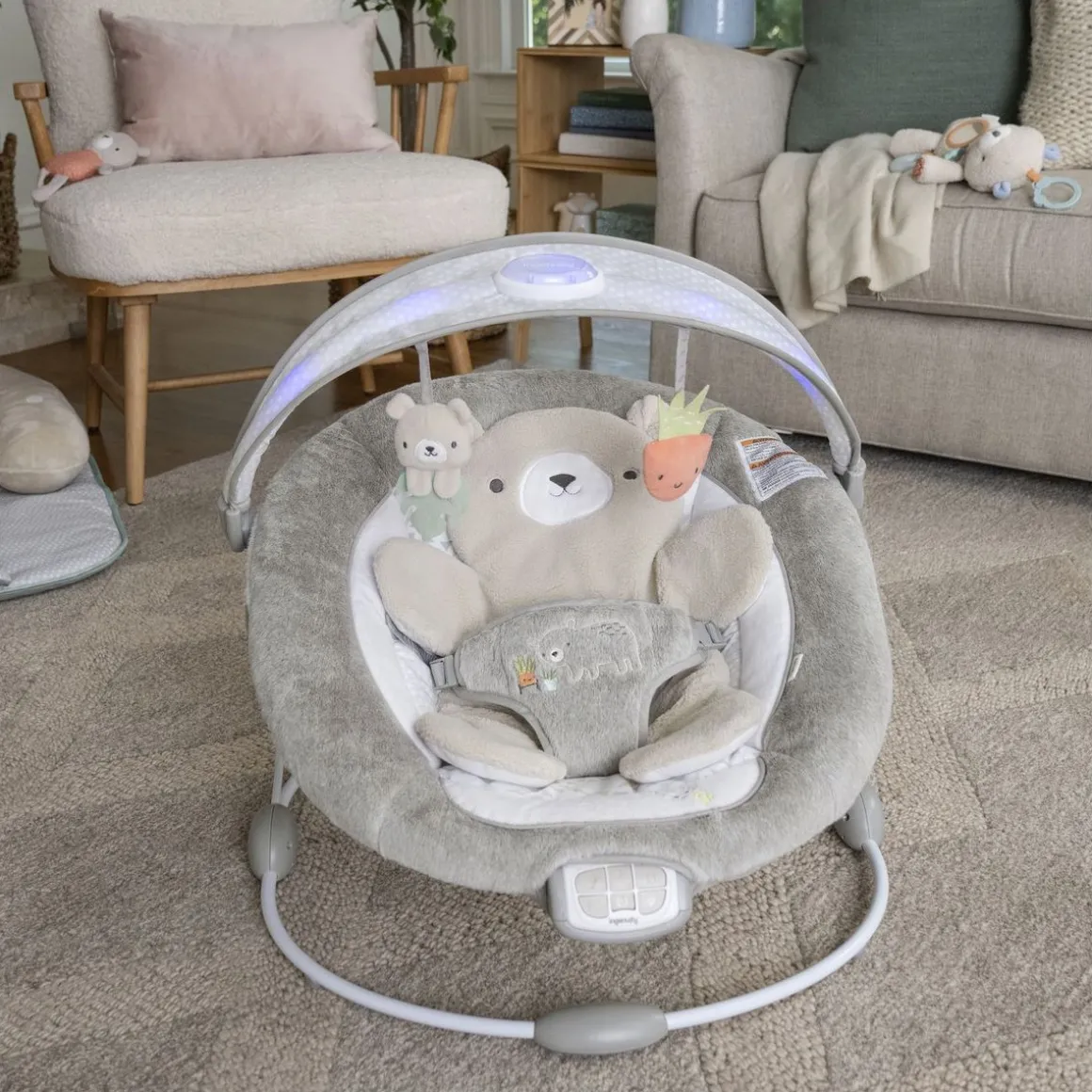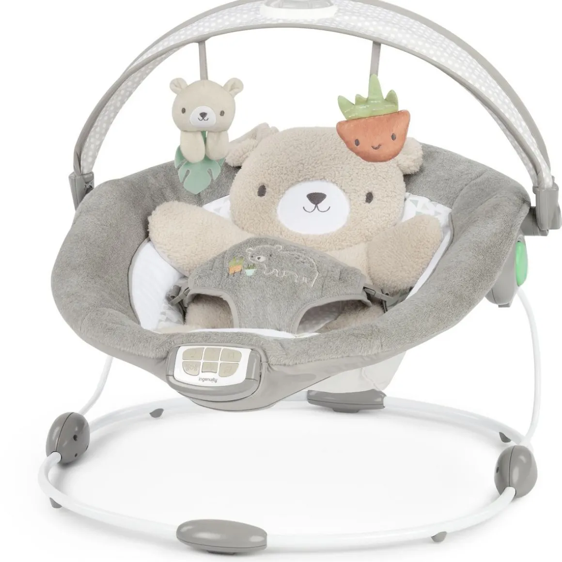 Ce transat Ingenuity InLighten Bouncer – Nate est idéal pour les parents très occupés, bébé est en sécurité. Pour les plus petits jusqu’à 6 mois ou 9kgs; âge ou poids max., Idéal le traversin petit ours (Nate) pour encore plus de support et confort. Traversin amovible tout doux à utiliser comme doudou. Siège totalement inclinable pour encore plus de confort, Avec arc d’activités lumineux et clignotant apaisant pour jouer; 2 jouets en peluche amusants inclus (un ours et une plante) bébé apprend à toucher et attraper, Stimulation des sens avec des vibrations douces, apaisantes, des airs calmes, sons nature et bruits blancs. Fonctionne avec 3 piles C (non incluses), Conception sécurisée et confort assurée; avec harnais 3 points d’attache bébé est en sécurité; housse de siège et traversin nettoyage facile, dimensions totales 62 x 60 x 59cm