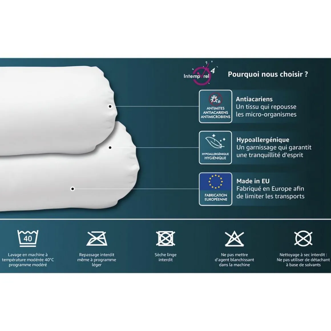 Traversin CONFORT anti acarien. Haute résilience. Couleur: Blanc. Composition: enveloppe : 100% polyester microfibre 85 Gr/m2, garnissage: 100 % polyester fibre creuse siliconnée 800 Gr. Lavable en machine Certification Oeko-Tex Fabrication européenne