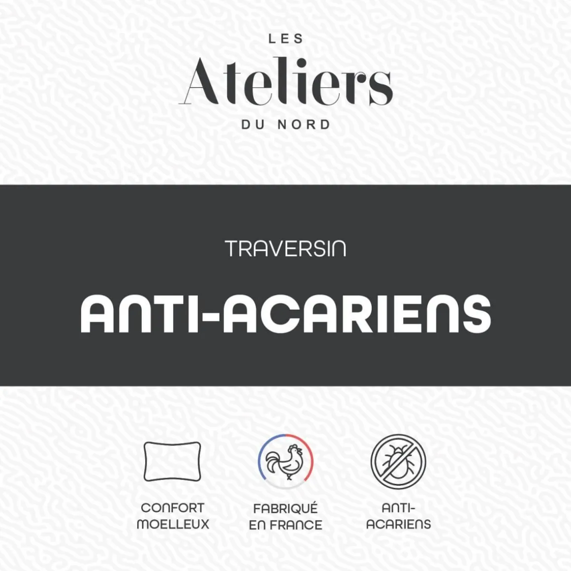 Le traversin Anti acariens des Ateliers du Nord se compose d’une enveloppe douce 100% coton bénéficiant d’un traitement à base d’huiles essentielles. Ce traitement à triple action vous permettra de lutter efficacement contre les acariens, les bactéries et les moisissures. Grace a son garnissage Polyester fibre creuse siliconée Isolane, ce polochon vous assure un confort moelleux, idéal pour vous détendre en position assise dans le lit. Avec son joli gonflant, il est aussi décoratif que confortable et il apportera la touche finale à votre lit.