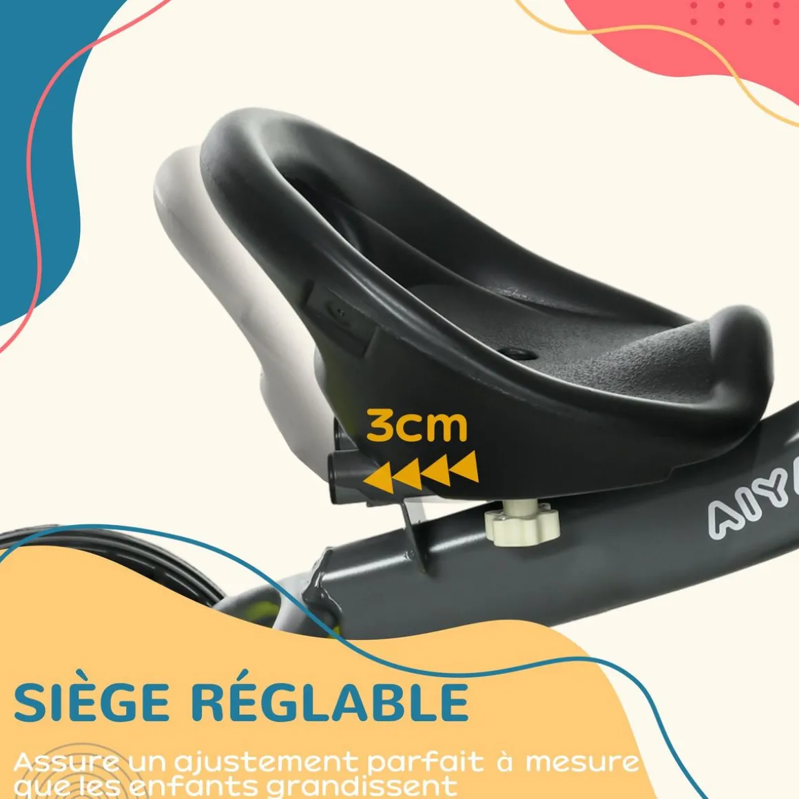 – Selle siège ergonomique réglable d’avant en arrière avec dossier ajouré : confort et sécurité au rendez-vous