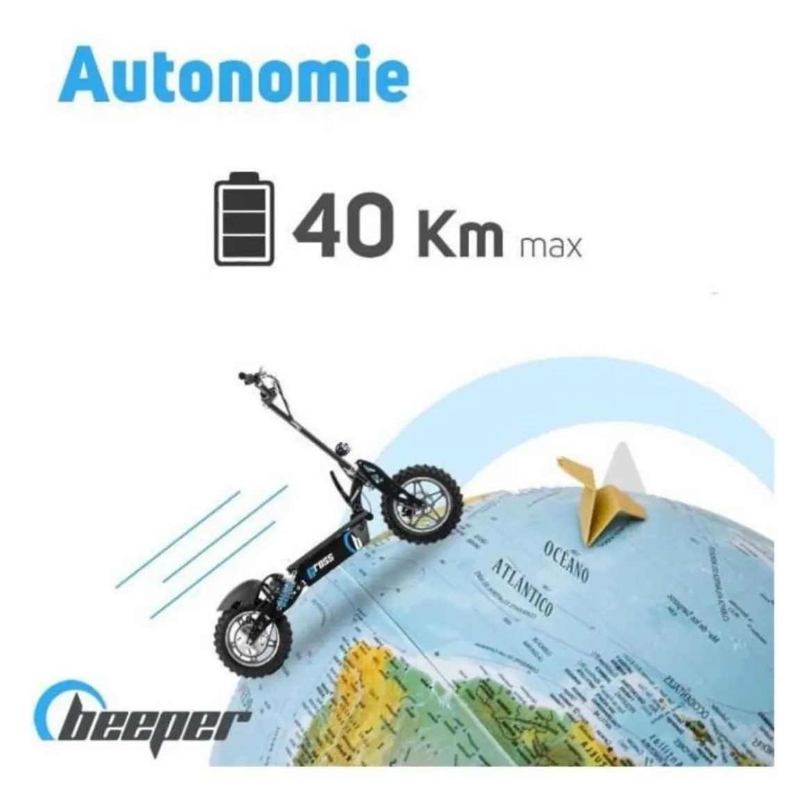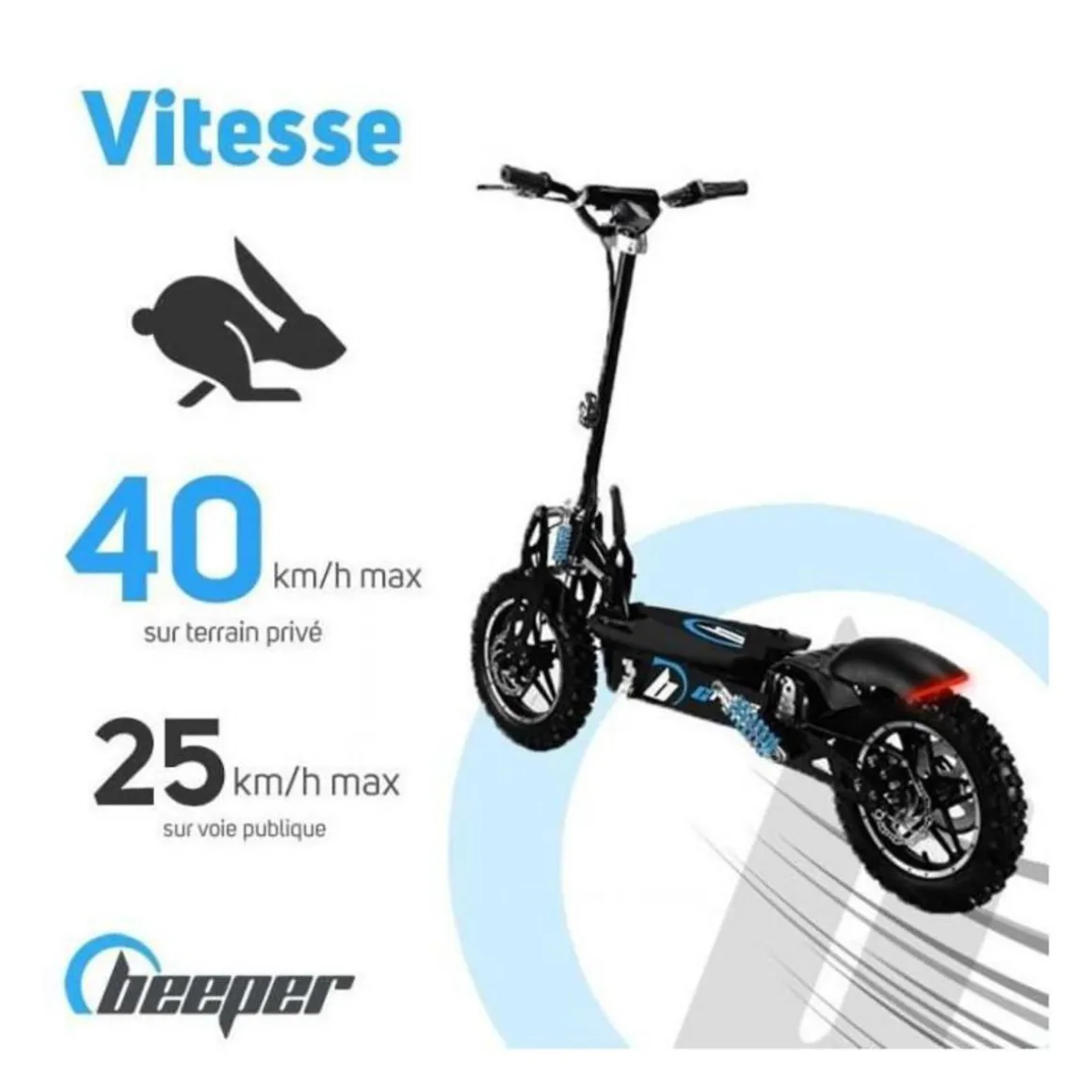 *** La TOUT-TERRAIN ** La trottinette electrique Beeper FX1600-S est LA trottinette tout-terrain ! Gr‰ce a ses pneus gonfles et crantes, elle vous amenera de partout. *** Moteur HAUTE PERFORMANCE 1600W *** Son moteur BRUSHLESS de 1600W peut atteindre une vitesse maximum de 40 km/h (sur voie privee). Sa batterie Lithium 48V 18Ah vous permet de parcourir jusqu’a 40km