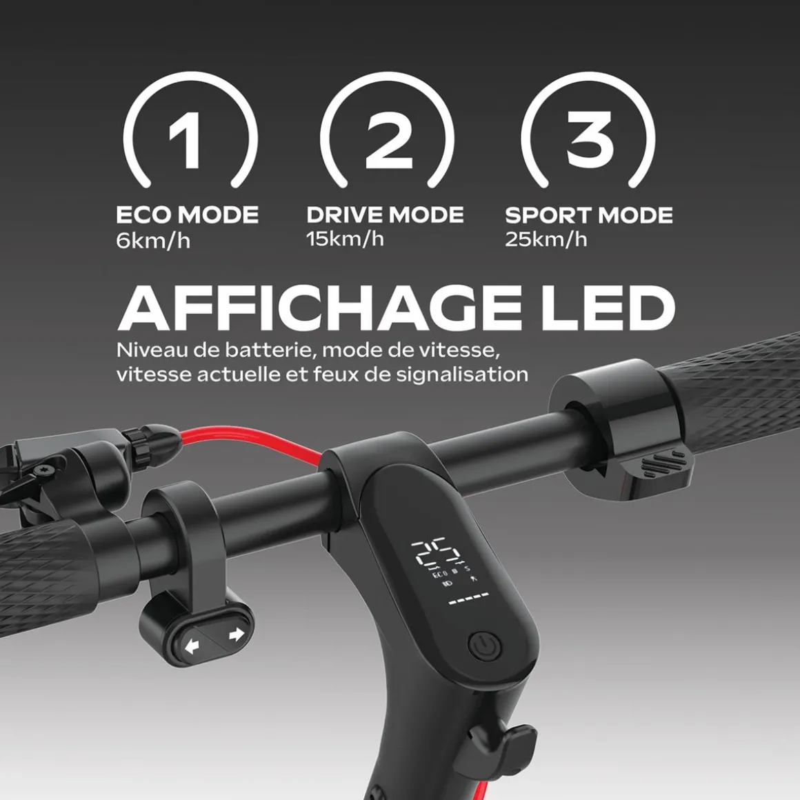 La vitesse et l’autonomie varient selon le terrain, la vitesse et le poids de l’utilisateur.