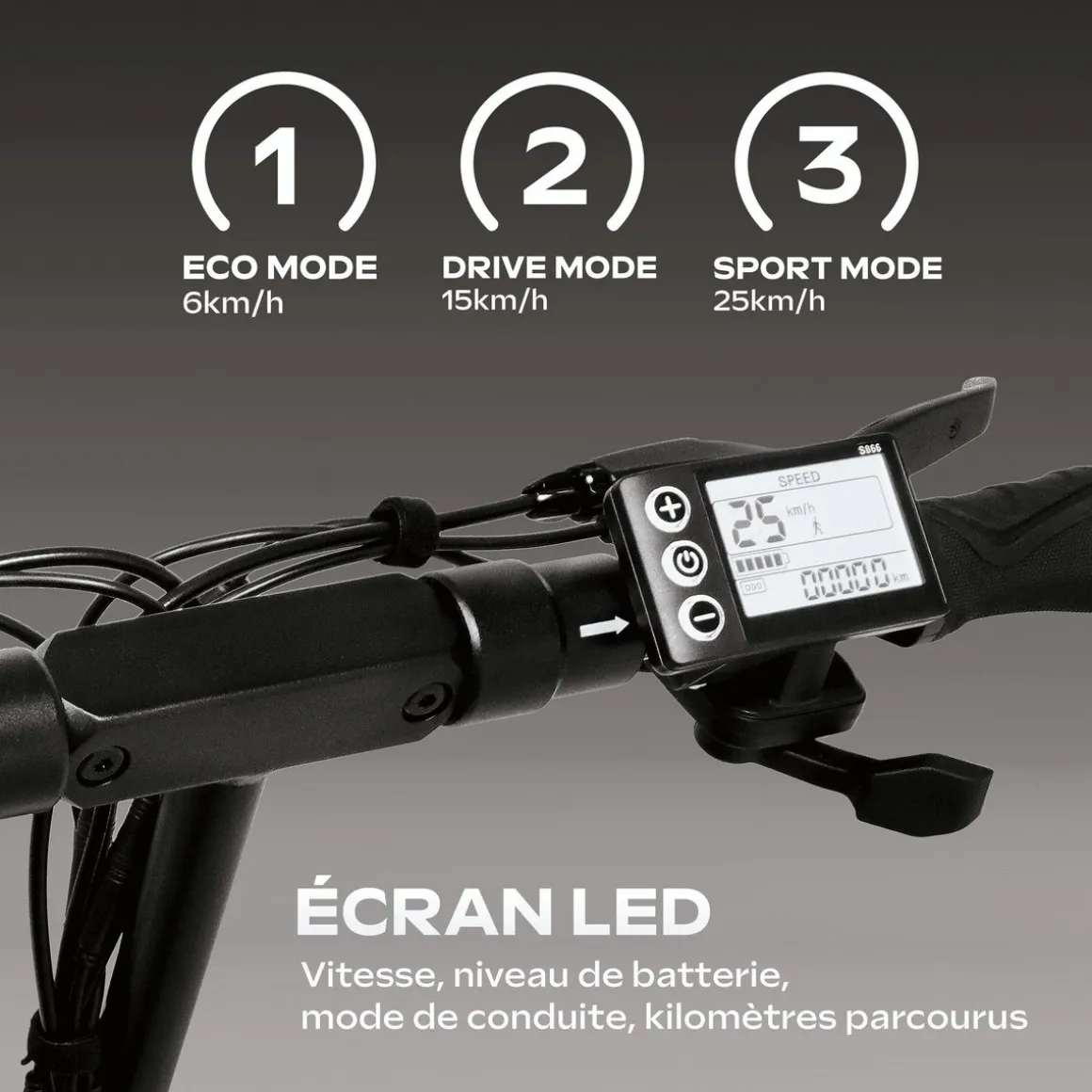 | Ecran d’affichage | Oui, permet de visionner des informations relatives à la conduite (autonomie batterie, distance parcourue, mode de vitesse, etc.) | |