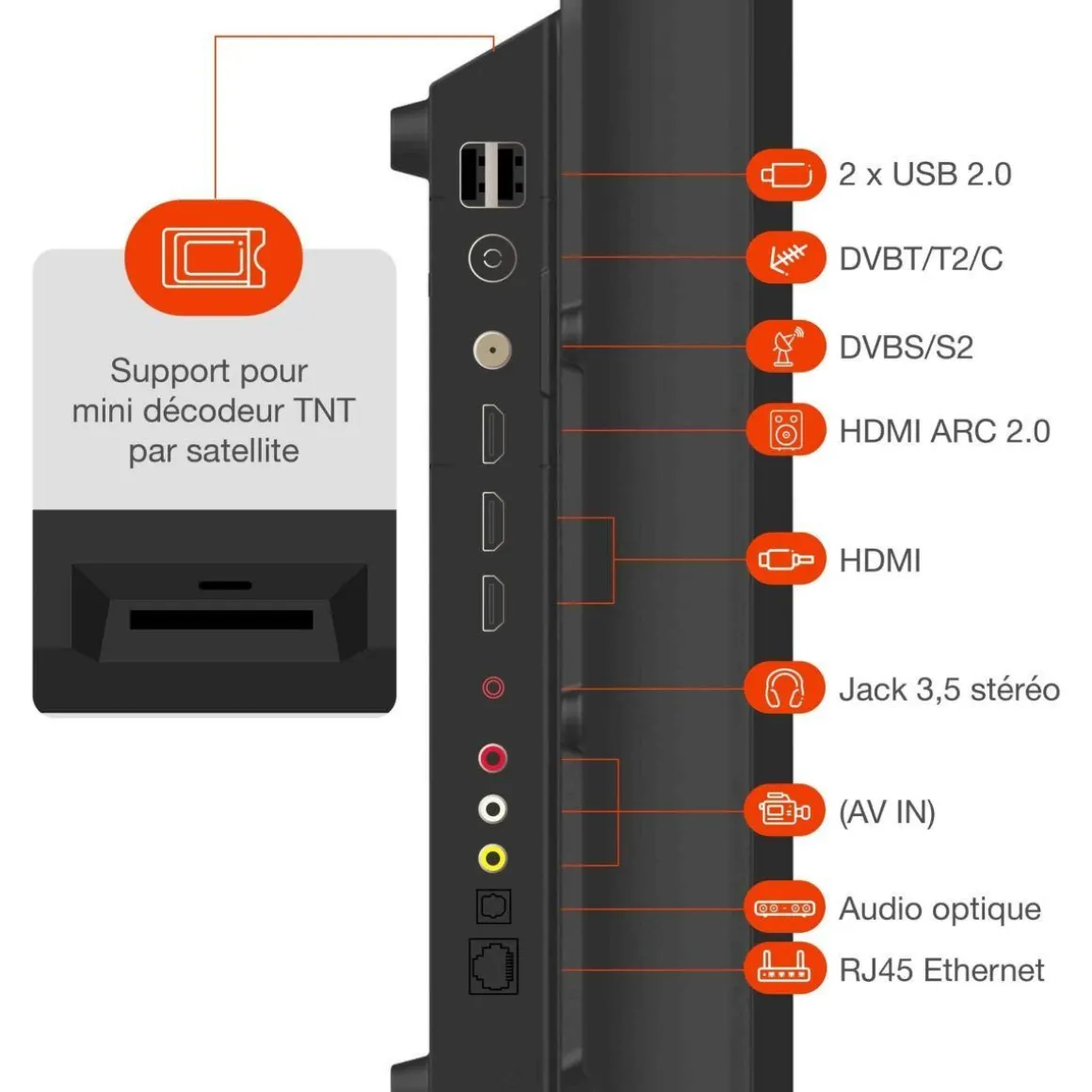 | Sortie optique | oui, permet d’envoyer le son de sa TV vers une barre de son en numérique, ou un casque TV avec un câble optique | |