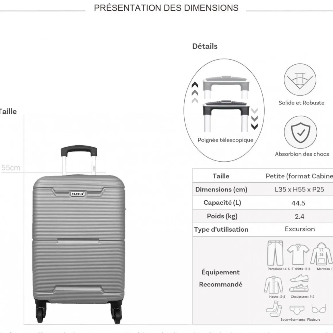 Les dimensions indiquées sont les dimensions extérieures des bagages, comprenant poignées, roulettes, pieds, poches latérales et autres éléments extérieurs.
