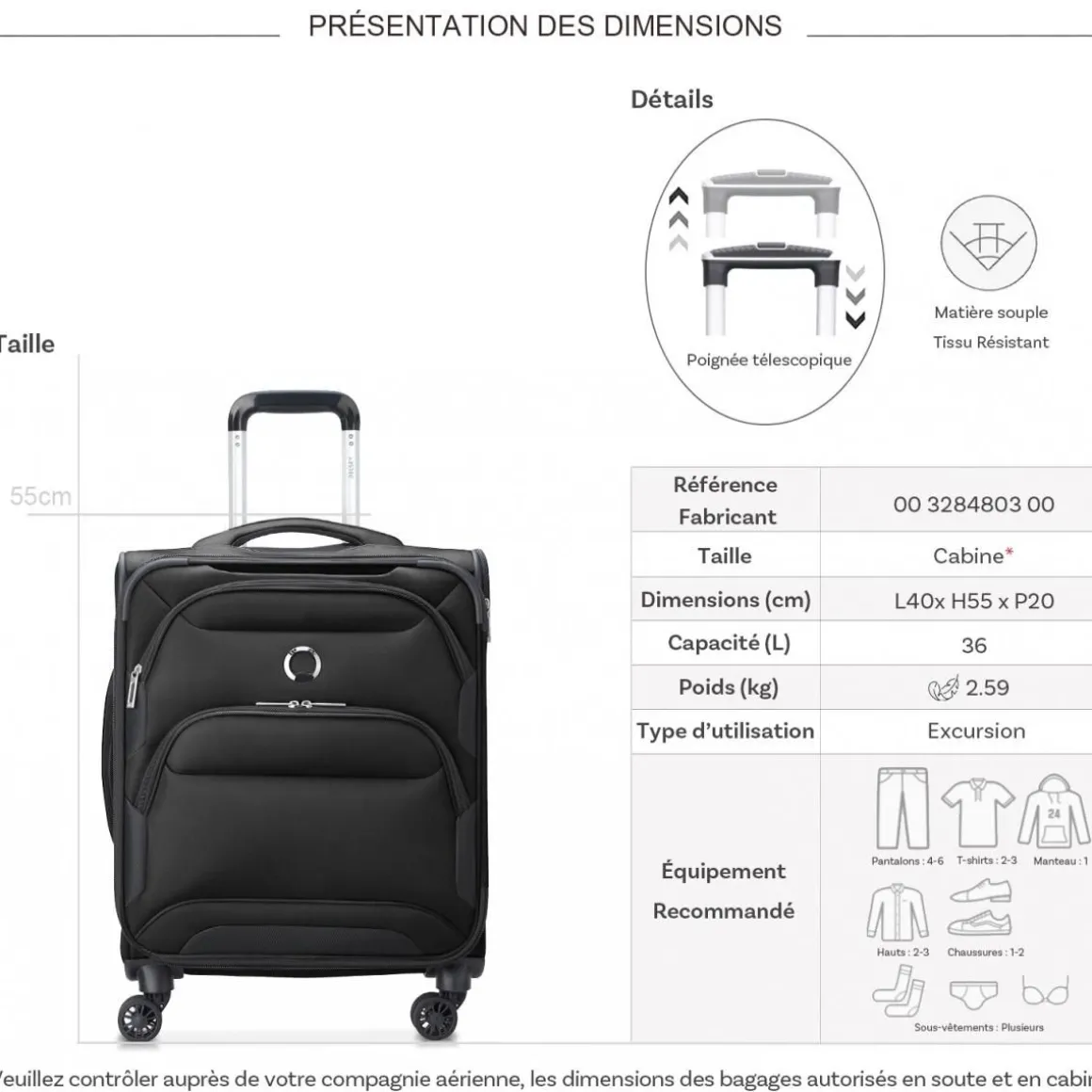 Les dimensions indiquées sont les dimensions extérieures des bagages, comprenant poignées, roulettes, pieds, poches latérales et autres éléments extérieurs.