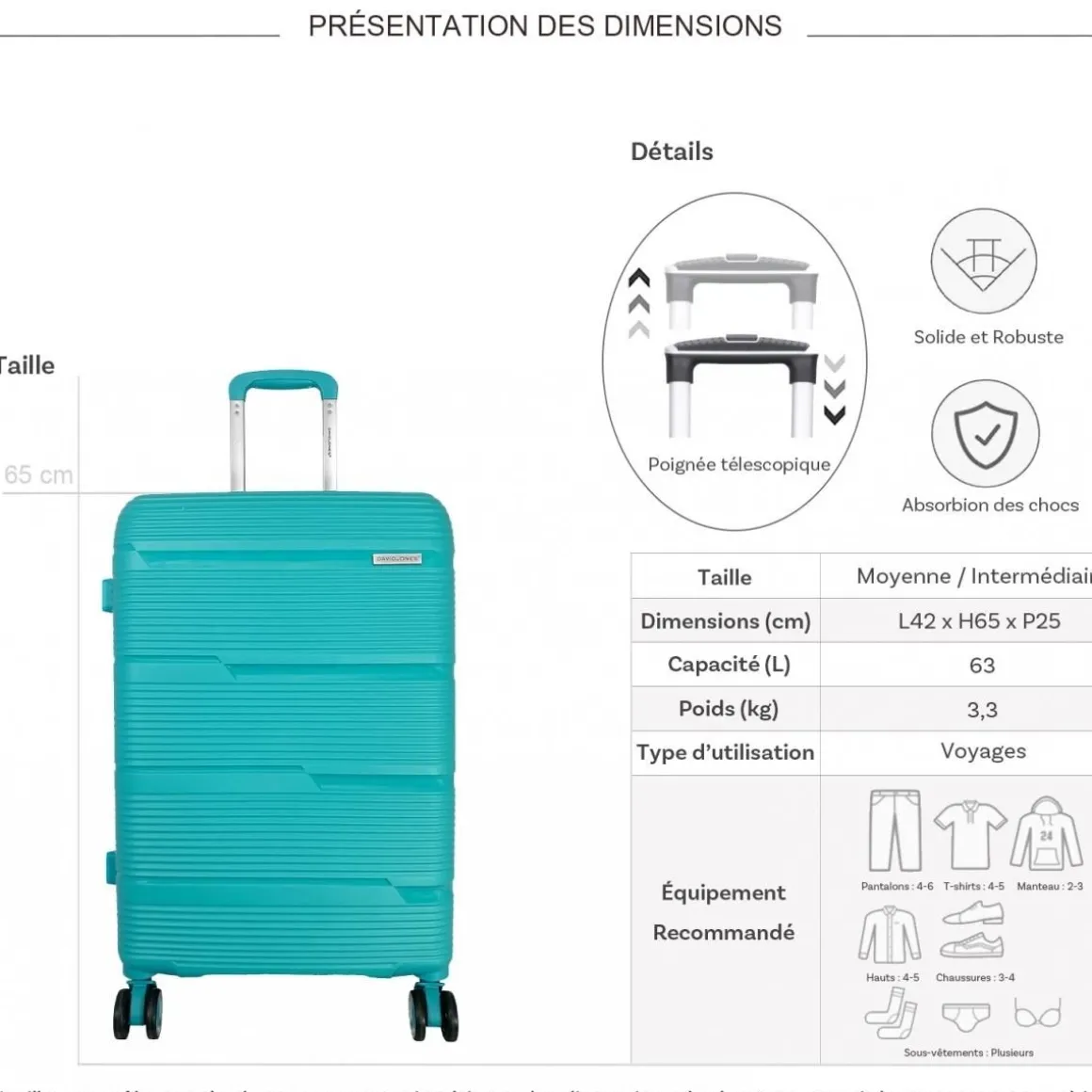 Les dimensions indiquées sont les dimensions extérieures des bagages, comprenant poignées, roulettes, pieds, poches latérales et autres éléments extérieurs.