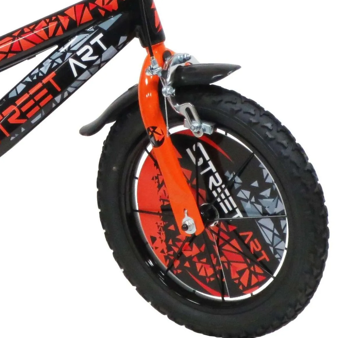 Vélo 14 Garçon Street Art pour enfant de 95/110 cm – Cadre Acier – Direction et pédalier en nylon – Roue libre monovitesse – Freins avant et arrière Calliper – Selle réglable – Carter de chaîne intégral – Gardes boue et poignées spécifiques pour augmenter la protection de l’enfant – Jantes à rayons – Pneus gonflables noirs – Stabilisateurs (montage sans outil) – Plaque décorative avant – Gourde – Avertisseur sonore – Eclairage à piles fournies