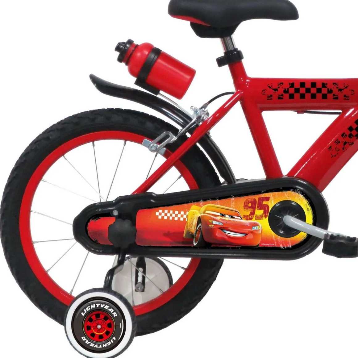 Vélo 16 Garçon Licence Cars pour enfant de 105/120 cm – Cadre Acier – Direction et pédalier en nylon – Roue libre monovitesse – Freins avant et arrière Calliper -Selle réglable – Carter de chaîne intégral – Gardes boue et poignées spécifiques pour augmenter la protection de l’enfant – Jantes à rayons – Pneus gonflables noirs – Stabilisateurs (montage sans outil) – Plaque décorative avant – Porte bidon – Gourde – Avertisseur sonore – Eclairage à piles fournies – Catadioptres de roues