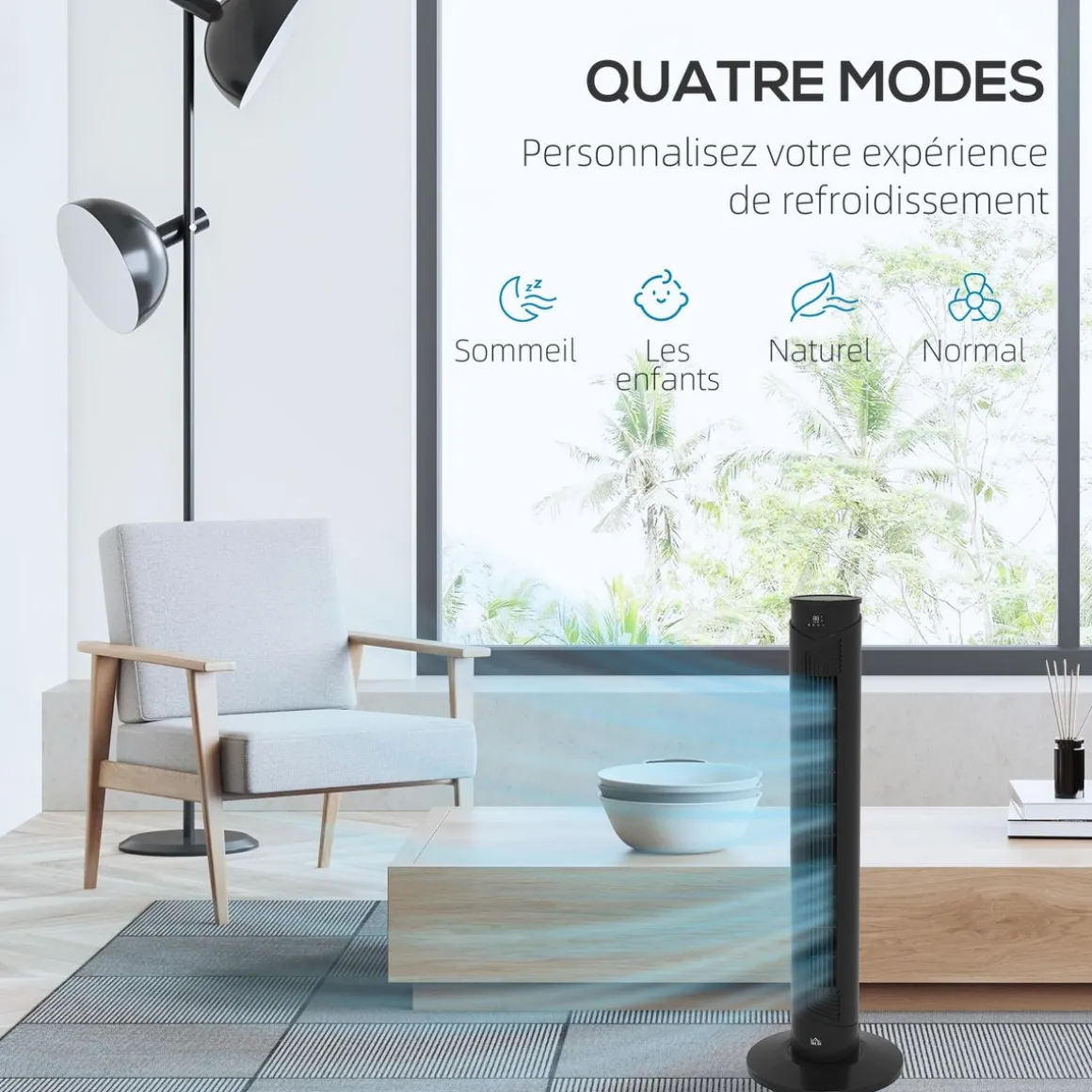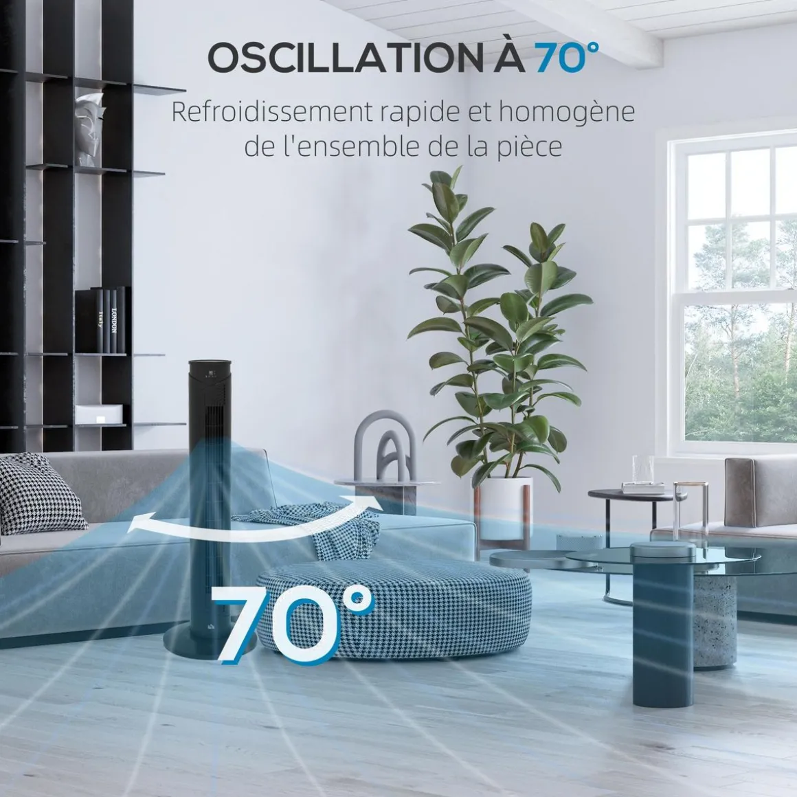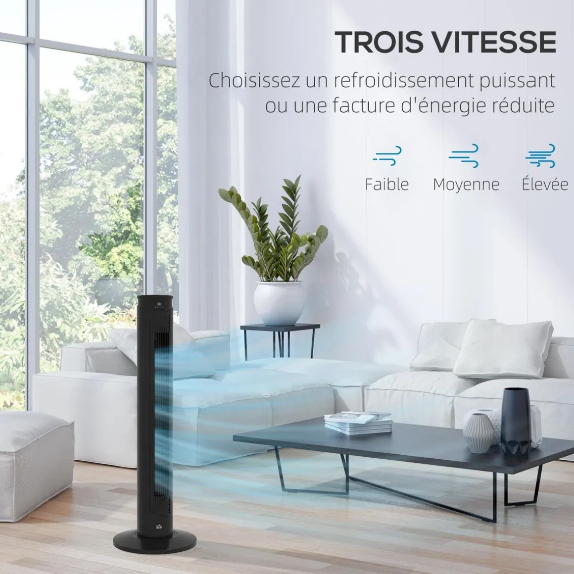 – Ventilateur colonne noir uni très élégant pour une intégration parfaite dans l’espace intérieur de votre choix : salon, chambre, bureau, etc.