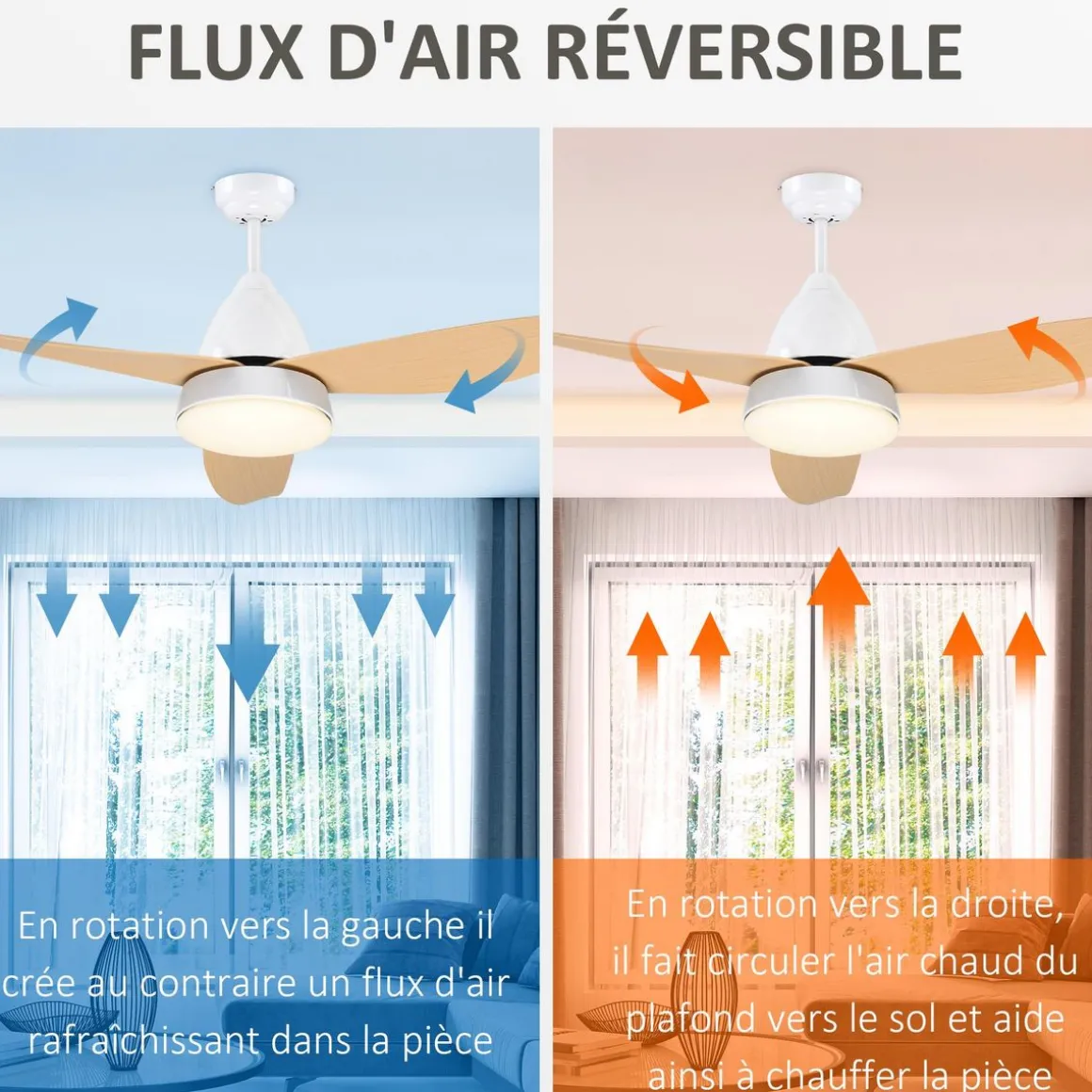 – Pales réversibles : rotation à droite, l’air chaud circule du plafond vers le sol et aide ainsi à chauffer la pièce en hiver