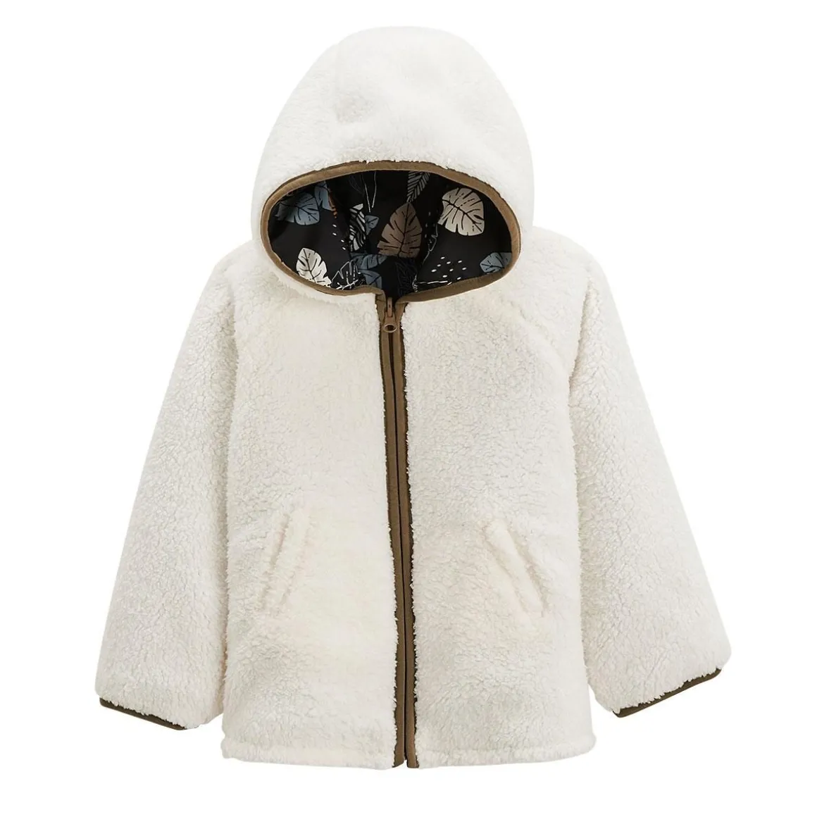 Ce n’est pas un mais deux ! Deux manteaux en un ? Si ça ce n’est pas le rêve ! Douillet ou chic, cette veste propose un côté tout doux en sherpa et un autre côté canon en tissu déperlant avec ce joli imprimé feuillage sur fond noir. Comment ne pas craquer ? Un 2-en-1 grâce à son côté réversible Face imprimée en polyester déperlant Ouverture zippée sur toute la longueur Une jolie capuche intégrée 2 petites poches de chaque côté
