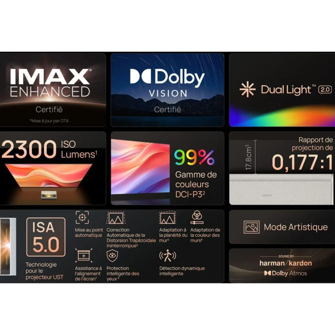 | HDMI ARC (audio return chanel) | Oui, permet d’utiliser la télécommande de votre vidéoprojecteur pour allumer et régler le volume de votre ampli, barre de son, console de jeu branché en HDMI disposant également de la norme ARC | |