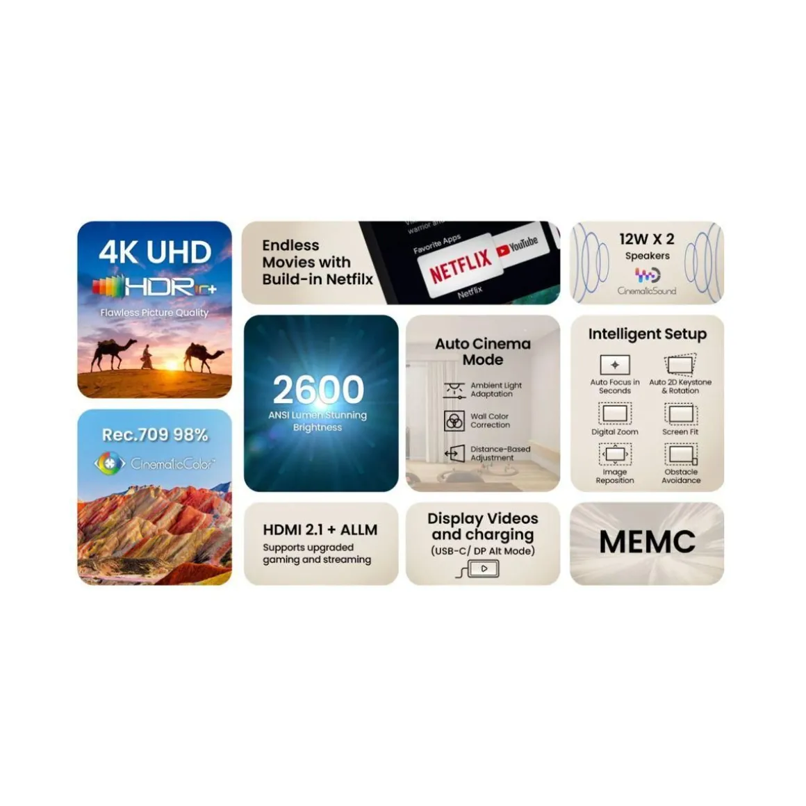 | HDMI ARC (audio return chanel) | Oui, permet d’utiliser la télécommande de votre vidéoprojecteur pour allumer et régler le volume de votre ampli, barre de son, console de jeu branché en HDMI disposant également de la norme ARC | |