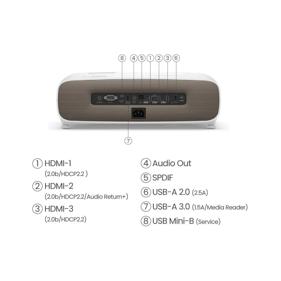 | HDMI ARC (audio return chanel) | Oui, permet d’utiliser la télécommande de votre vidéoprojecteur pour allumer et régler le volume de votre ampli, barre de son, console de jeu branché en HDMI disposant également de la norme ARC | |