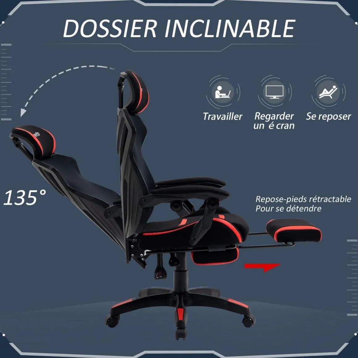 – Dossier inclinable jusqu’à 135°, idéal pour profiter d’un instant de repos