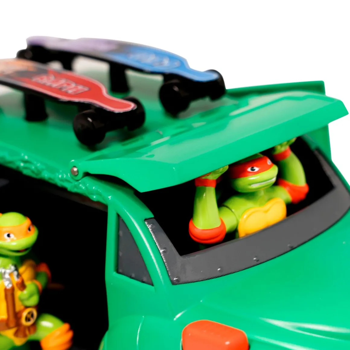 Ce véhicule exceptionnel n’est pas seulement une simple voiture, il se transforme pour révéler des fonctions de combat avancées, incluant des sons, des lumières et un lance-roquette pour passer instantanément en mode bataille. En appuyant sur les roues des skateboards situés sur le toit du véhicule, les quatre personnages des Tortues Ninja apparaissent, prêts à l’action !
